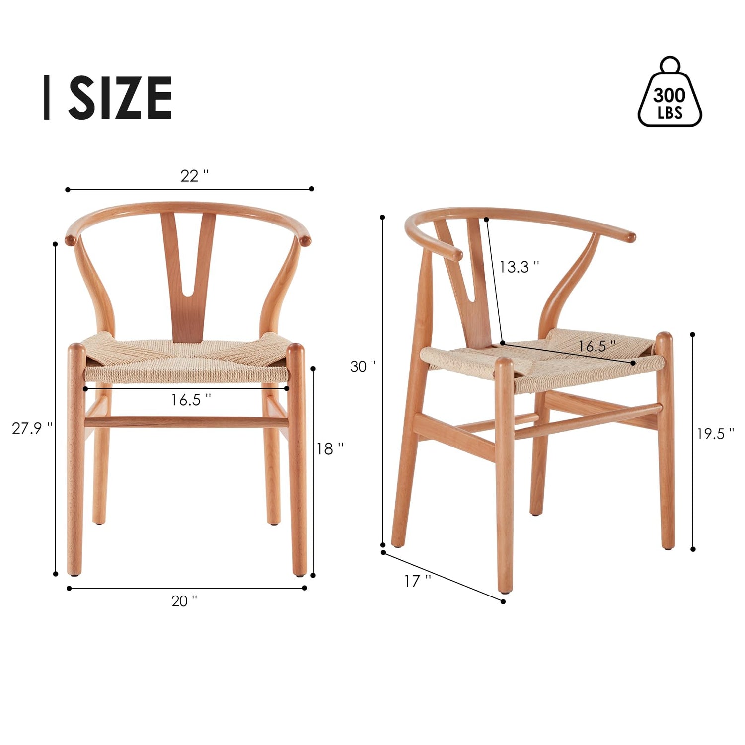 - Wishbone Chair Dimension: Total Dimensions: 17"D x 20"W x 30"H; Seat Dimensions: 16.5"D x 16.5"W x18"H; Item Weight: 10.5 lb. Please refer to the picture for more size information.The wishbone chairs are normal sized and height were perfect not to low for the average table
