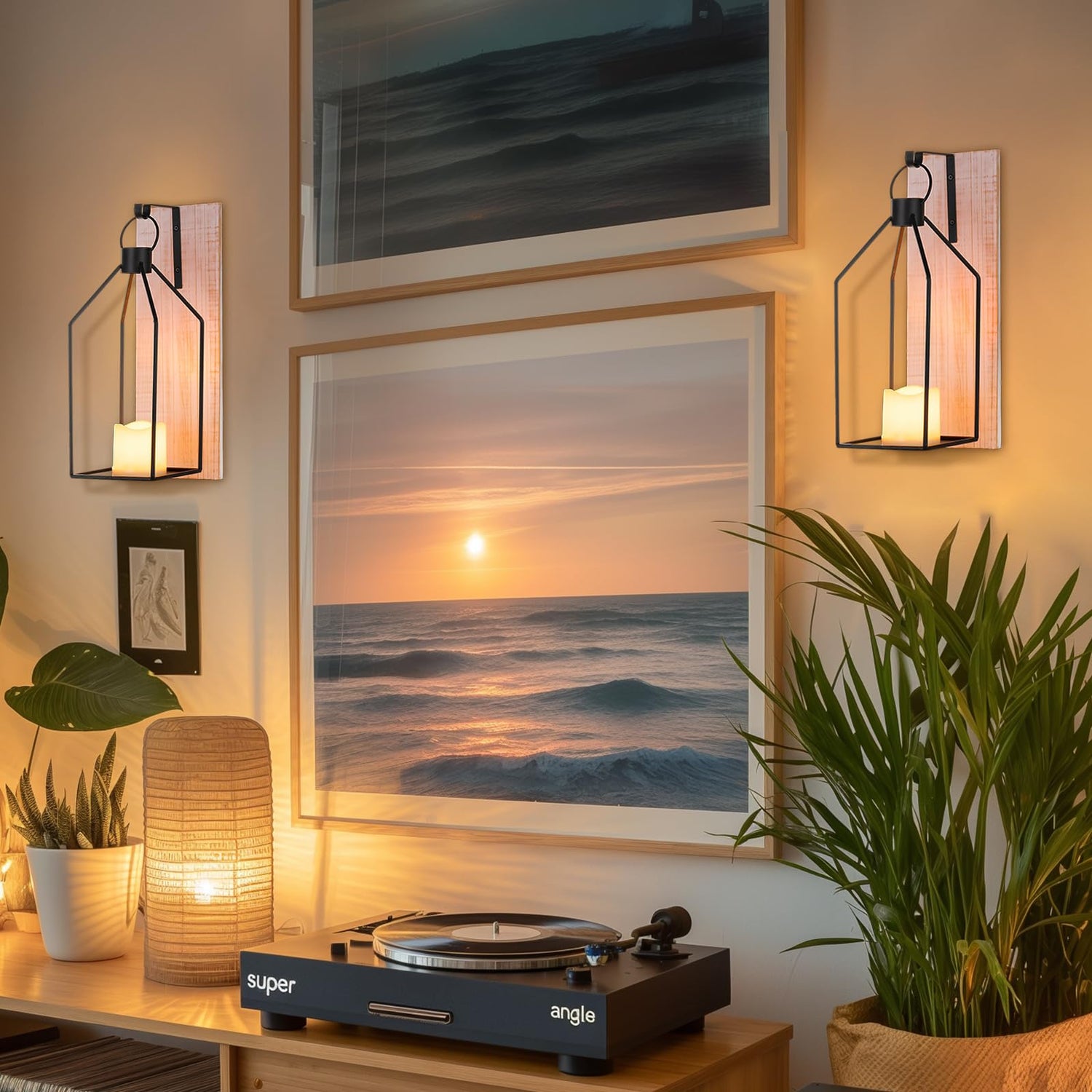 Details: Staymoment Candle Sconces Wall Decor Set of 2 - Farmhouse Wood Candle Holder - Indoor Black Metal Lantern Decorations for Living Room Front Porch Yard