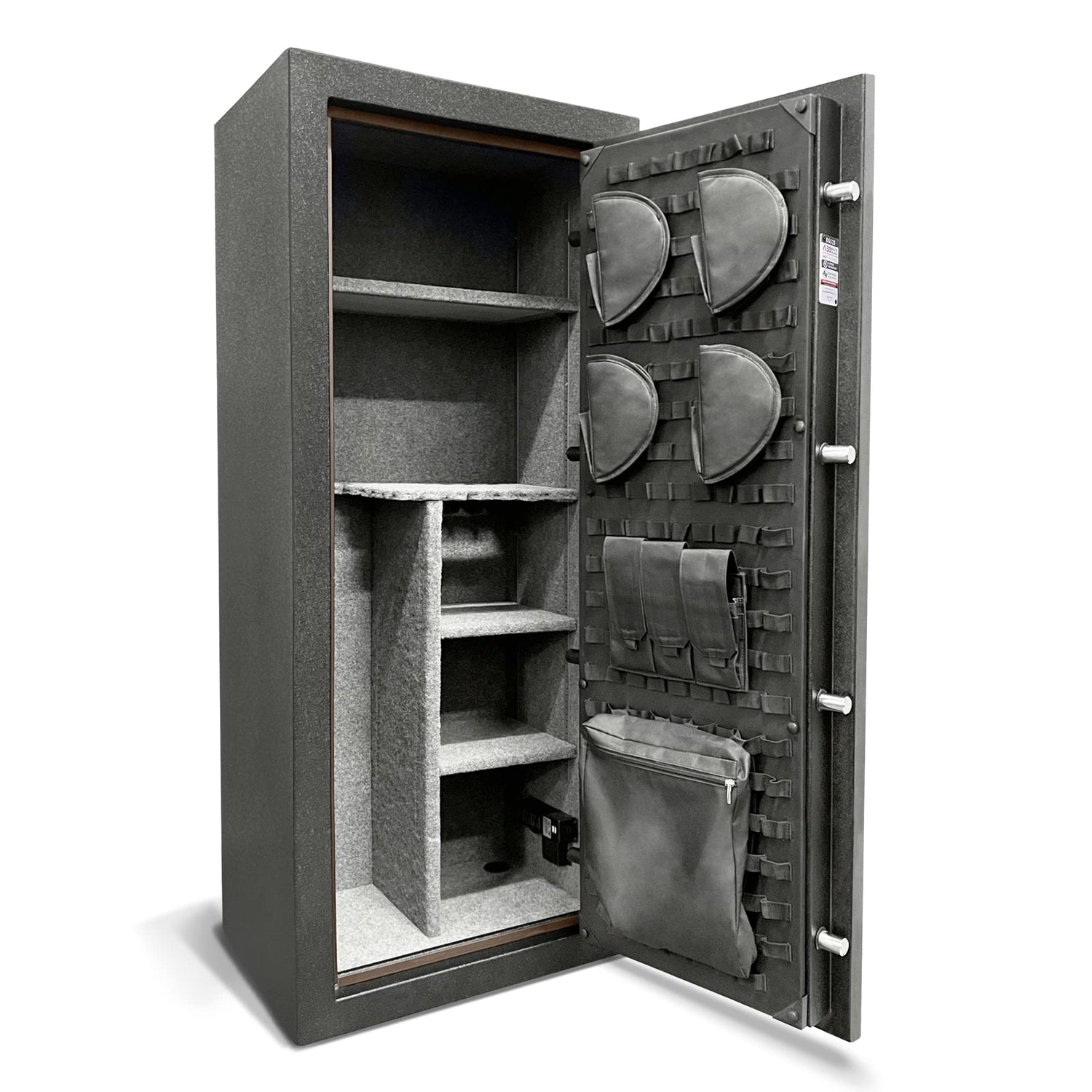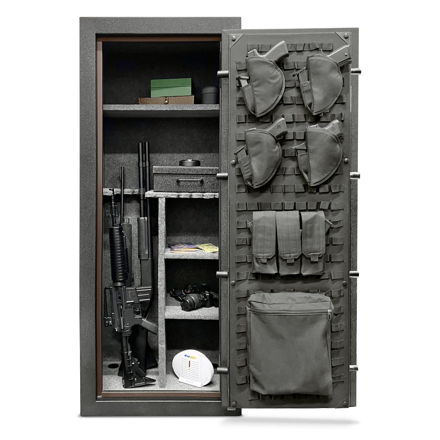 - INTERIOR FEATURES: 23 Long Gun Capacity with Interior Dual Gun Rack | Adjustable Interior Shelving | Pre-Installed Power Outlet Kit to Plug in Items Inside with 3 Outlets & 2 USB Slots | Completely Customizable Molle Door Panel Organizer with All Accessories Included