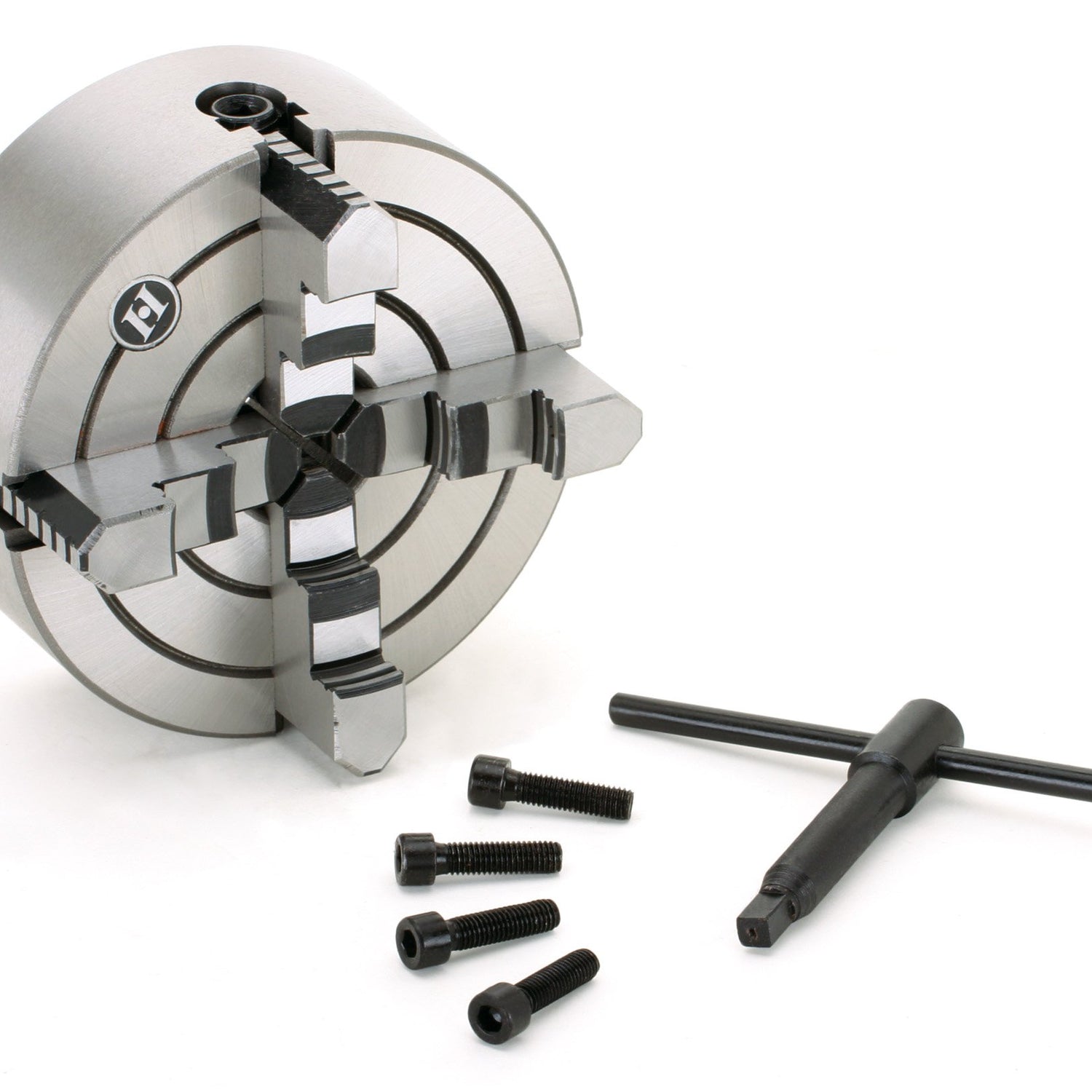 Each jaw moves independently. Such 4-Jaw Chucks are used for holding odd shaped pieces or where zero tolerance is required. This 6-Inch 4-jaw chuck with a 1-1/2-Inch bore has semi-steel bodies and hardened reversible jaws.