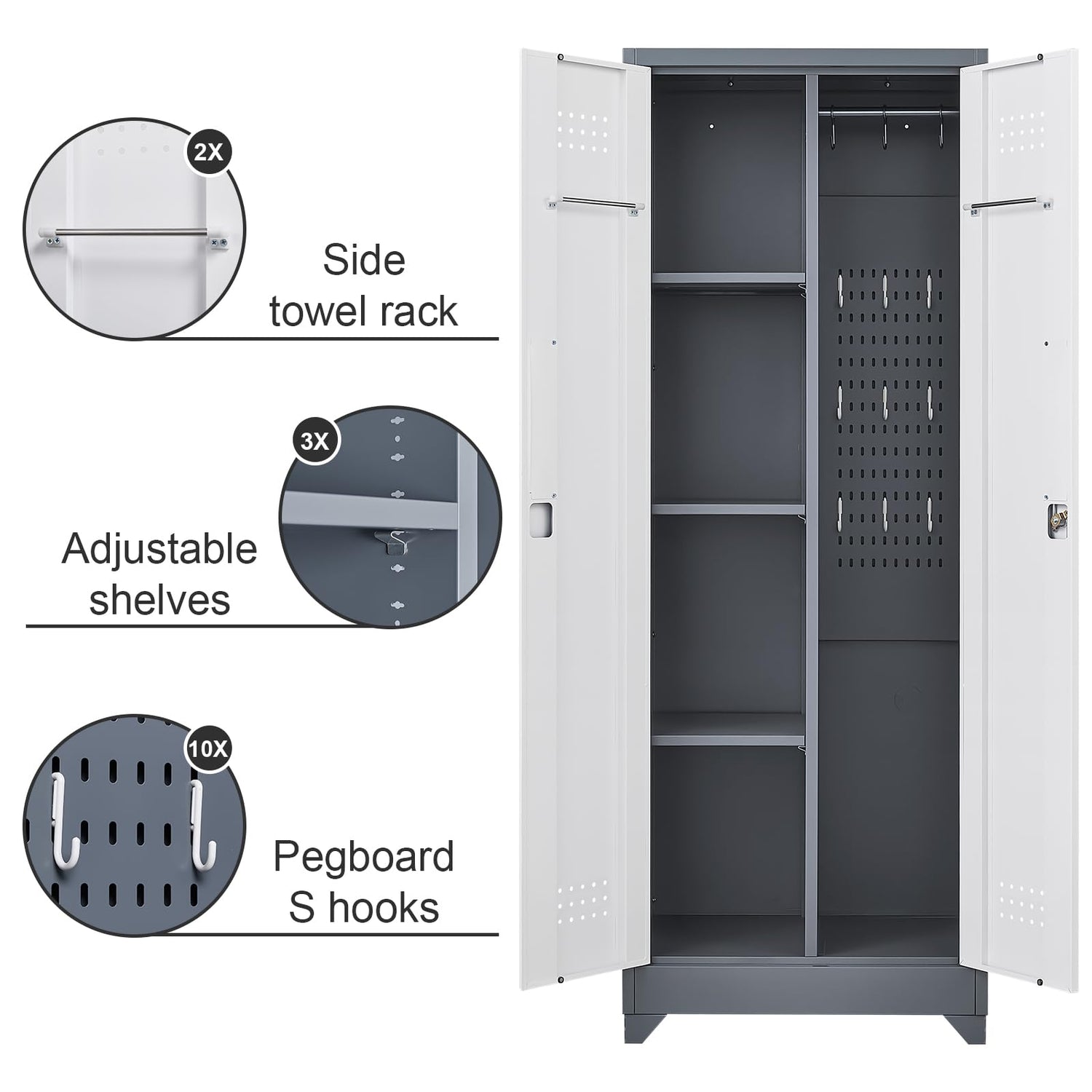 - [Multifunctional design]: This cleaning tool storage cabinet design with clothes rails, pegboard and adjustable shelves allows you to flexibly arrange the internal space to meet the storage needs of different items, suitable for offices, storage rooms, utility room, gym, garage