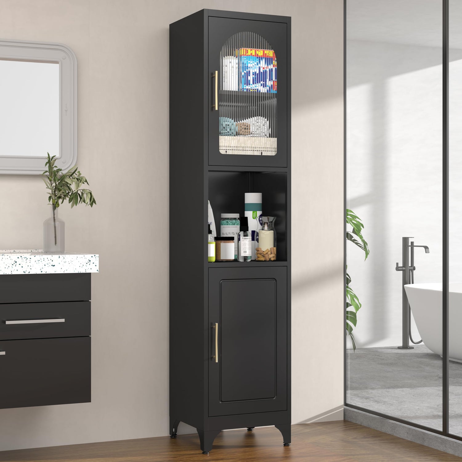 - 【Sturdy and Safe】The slim bathroom storage cabinet in metal, showing great robustness. It has a tip-preventing design, and the cabinet body can be fixed to the wall, enhancing stability and ensuring safety,size:74.8"H x 16.6"W x 15.7"D