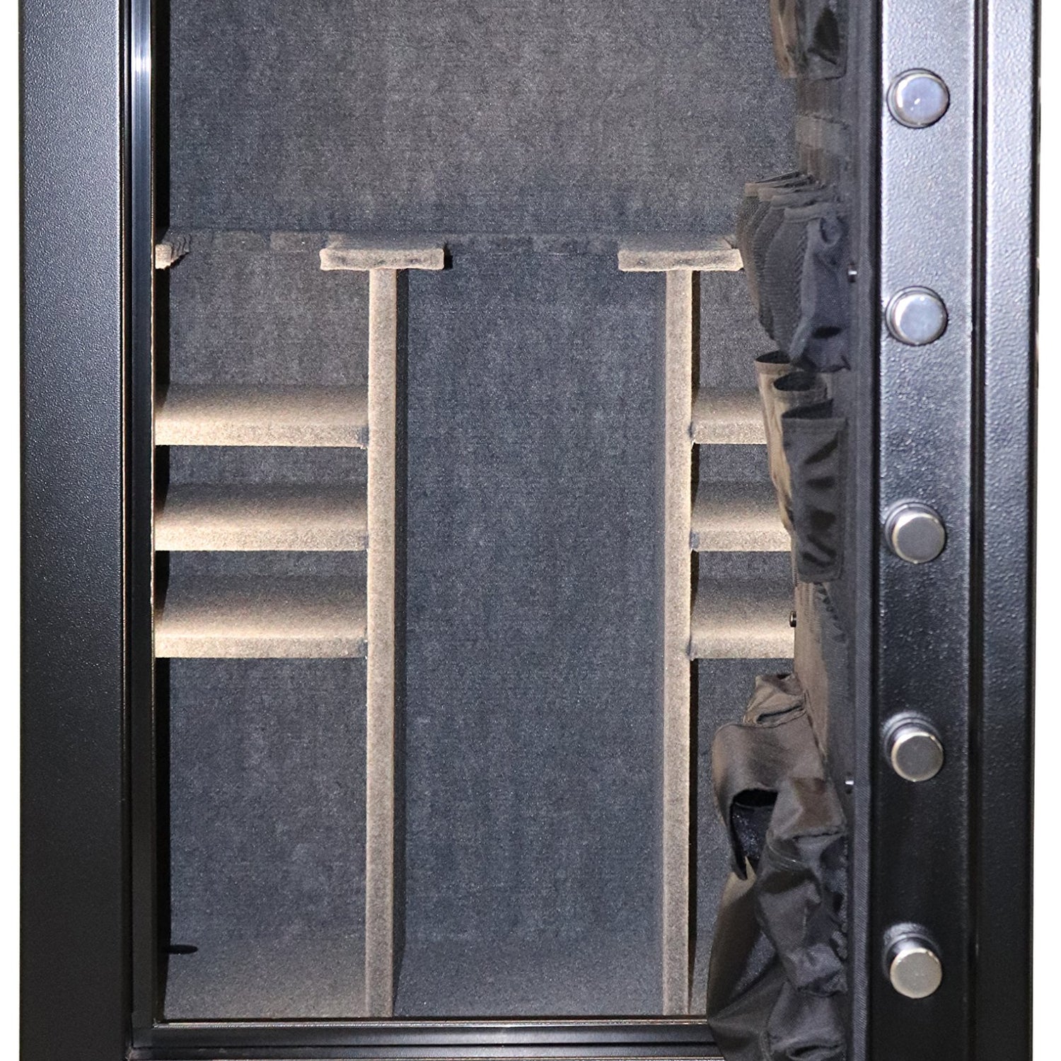- Semi-gloss textured powder coat black finish with silver pin stripping and polished chrome 5-spoke handle, Fully upholstered grey interior that features a three-section gun rack that can store a maximum of (13) long guns within each section and includes (7) adjustable/removable shelves for additional storage options.