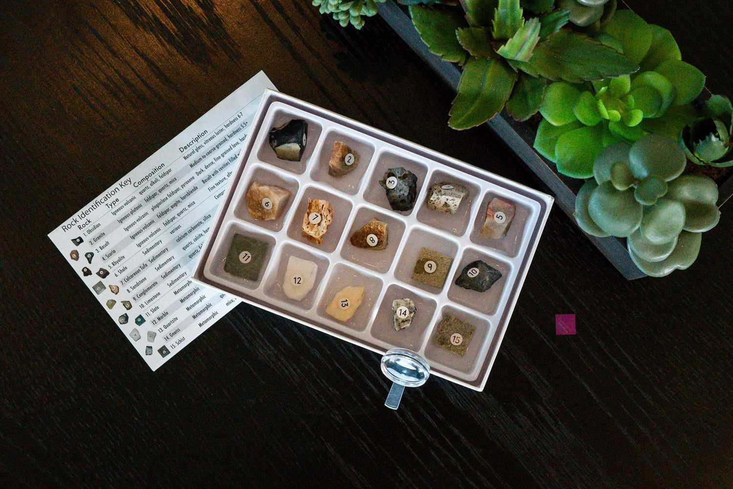 - The kit includes fifteen (15) rock specimens, plus a magnifying viewer and a handy identification guide