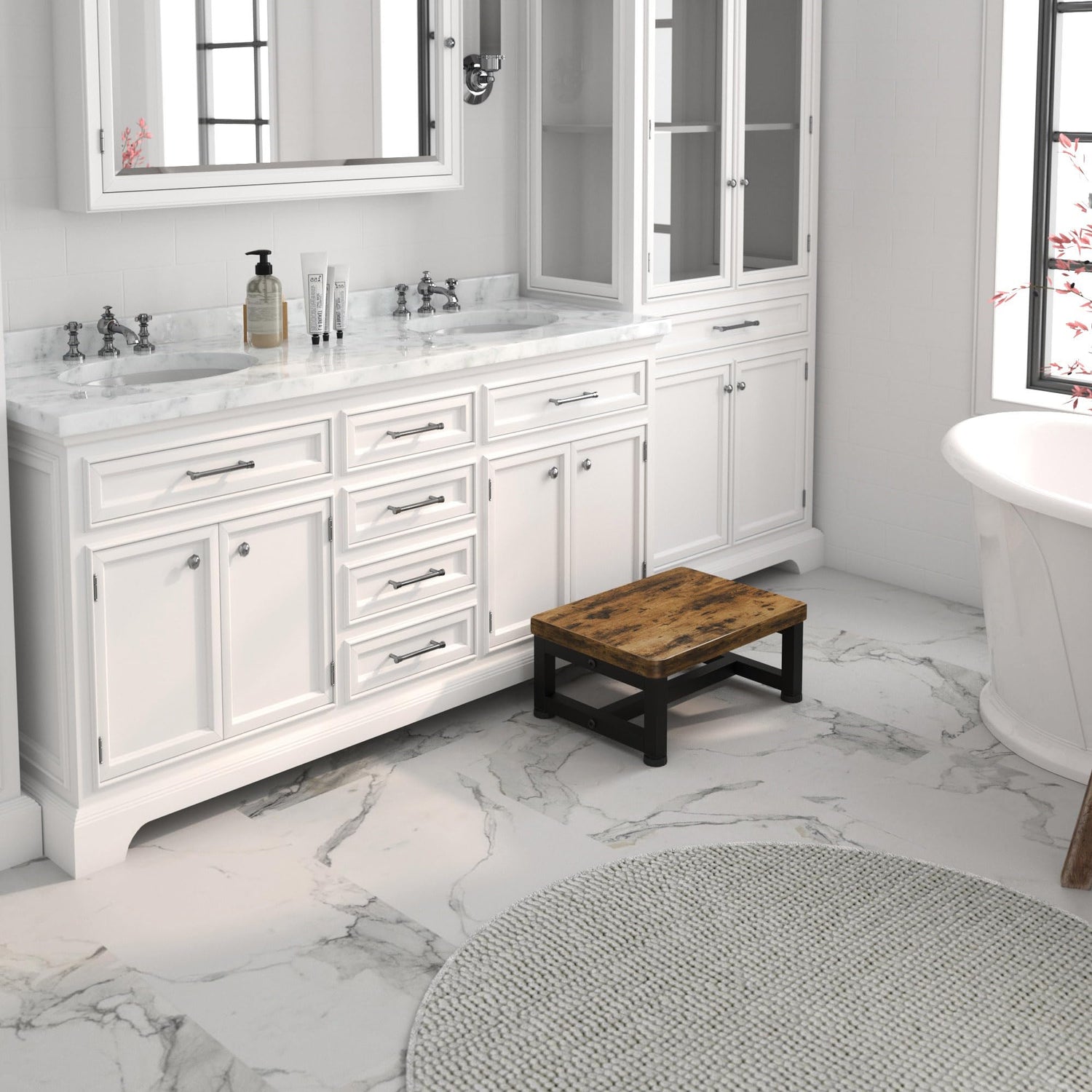 - 【Multi-functional & Multi-location】Step foot stool is great for kitchen, bathroom, bedroom, balcony, office, dining room, garden, porch, garage, or outdoor camping, fishing, etc. Metal step stool can be used as toddler step stool, kitchen step stool, bathroom step stool, bed step stool, closet step, or as a temporary seat for outdoor activities. Wood stool is widely used and can be used for many places