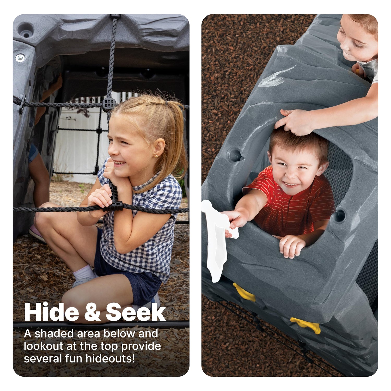 - NATURAL DESIGN: Rock wall blends with the backyard, easy grab junior grips for small hands, jungle gym with over 100 sqft of climbing area, maximum weight: of 300 lbs.