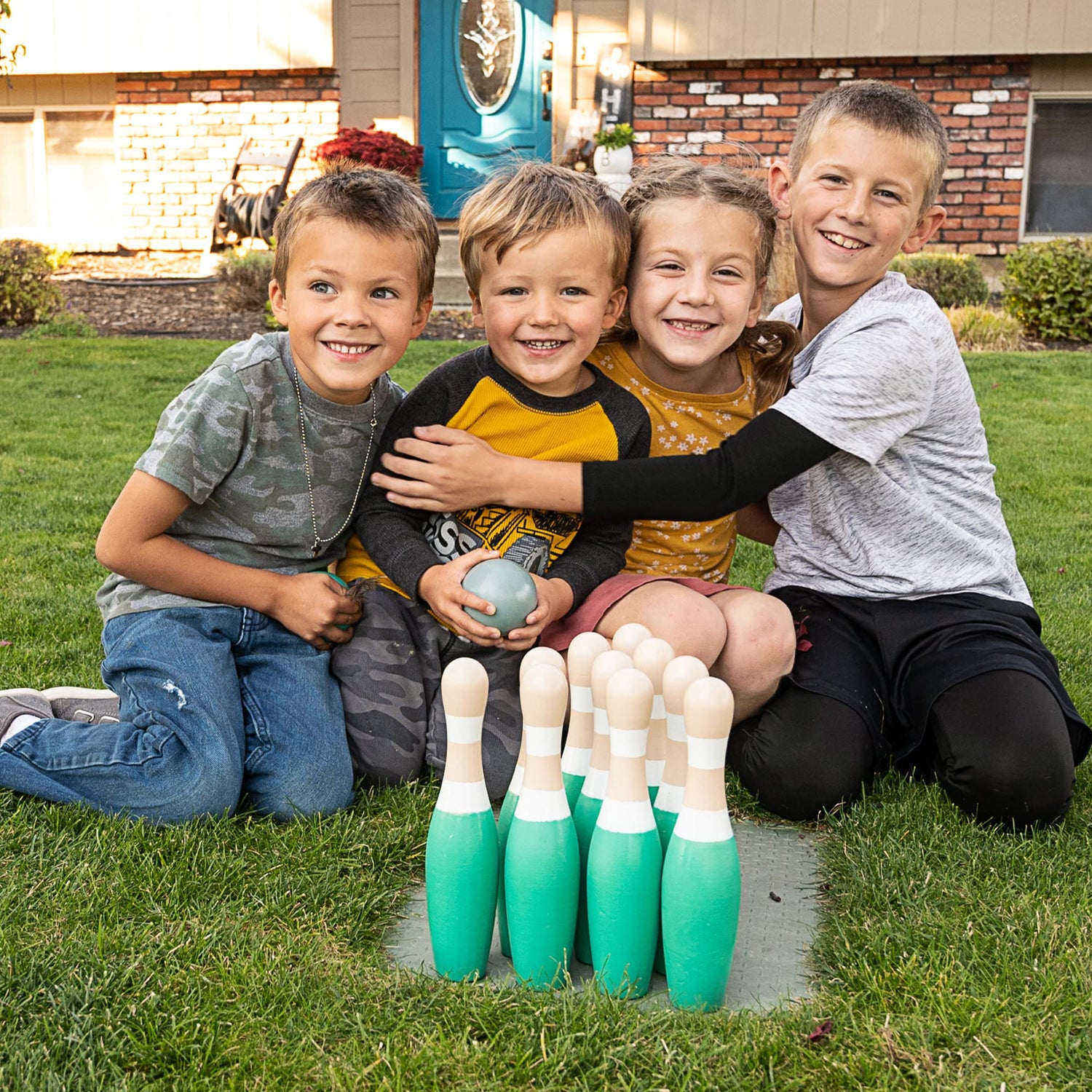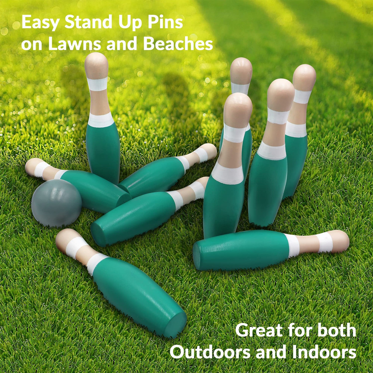 - DURABLE DESIGN: The skittles pins are made with polished New Zealand pine and can withstand the hitting and smashing from the wooden bowling ball for years. The wooden bowling pins has a unique Turquoise Green and Neutral Gray design and matching bowling balls.