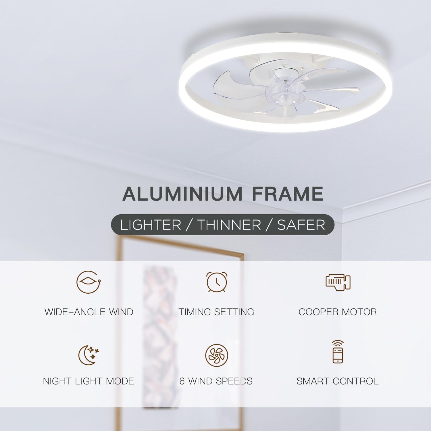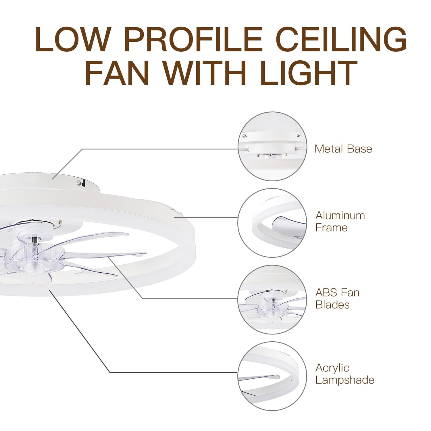 - 20'' Flush Mount Ceiling Fan : Upgrade pure copper DC motor,7 anti-wobble fan blades, Aluminium Frame, lighter, thinner, safer, and durable. The low profile ceiling fan runs smoothly and quietly with strong airflow. The semi-enclosed structure keeps you and your family safe from rotating blades and adds beauty to the room with the sleek design. Ideal for small rooms with low ceilings and elevated beds, fully saving space for you.
