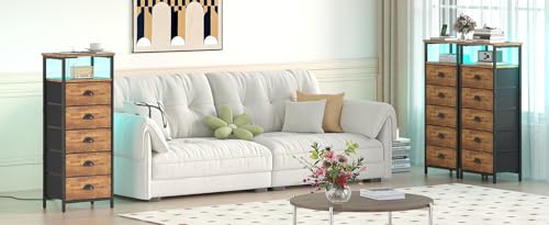 sthmec Nightstand with Charging Station,LED Night Stand with 5 Fabric Drawers, Bedside End Tables, 2-Tier Open Storage Shelf Side Table Nightstands with Drawers for Bedroom,Rustic Brown