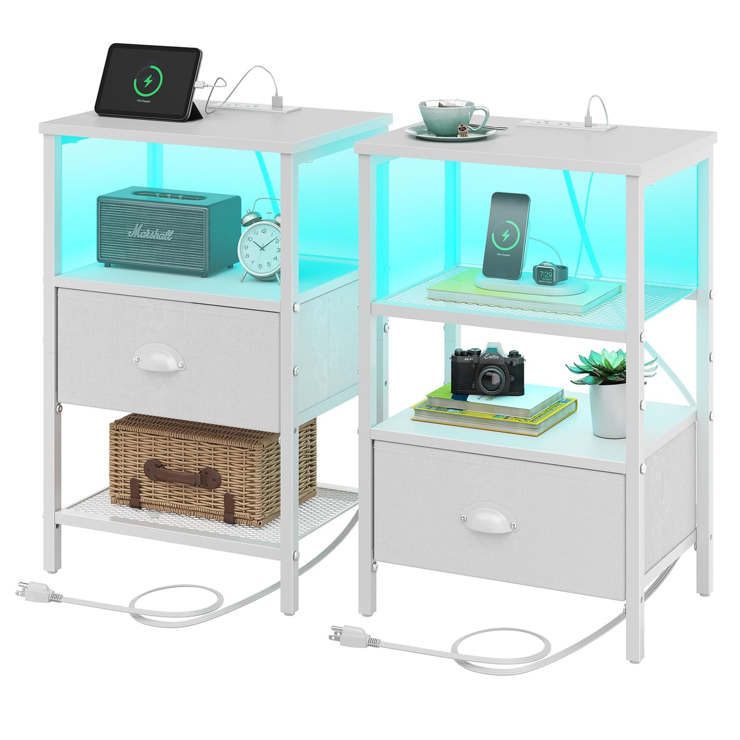 Sthmec Nightstands Set of 2, LED Bedside Tables with Charging Station and Fabric Drawer, Night Stand with Storage, 3 Tier Side Table with Open Shelf, LED Nightstand with Charging Station, White