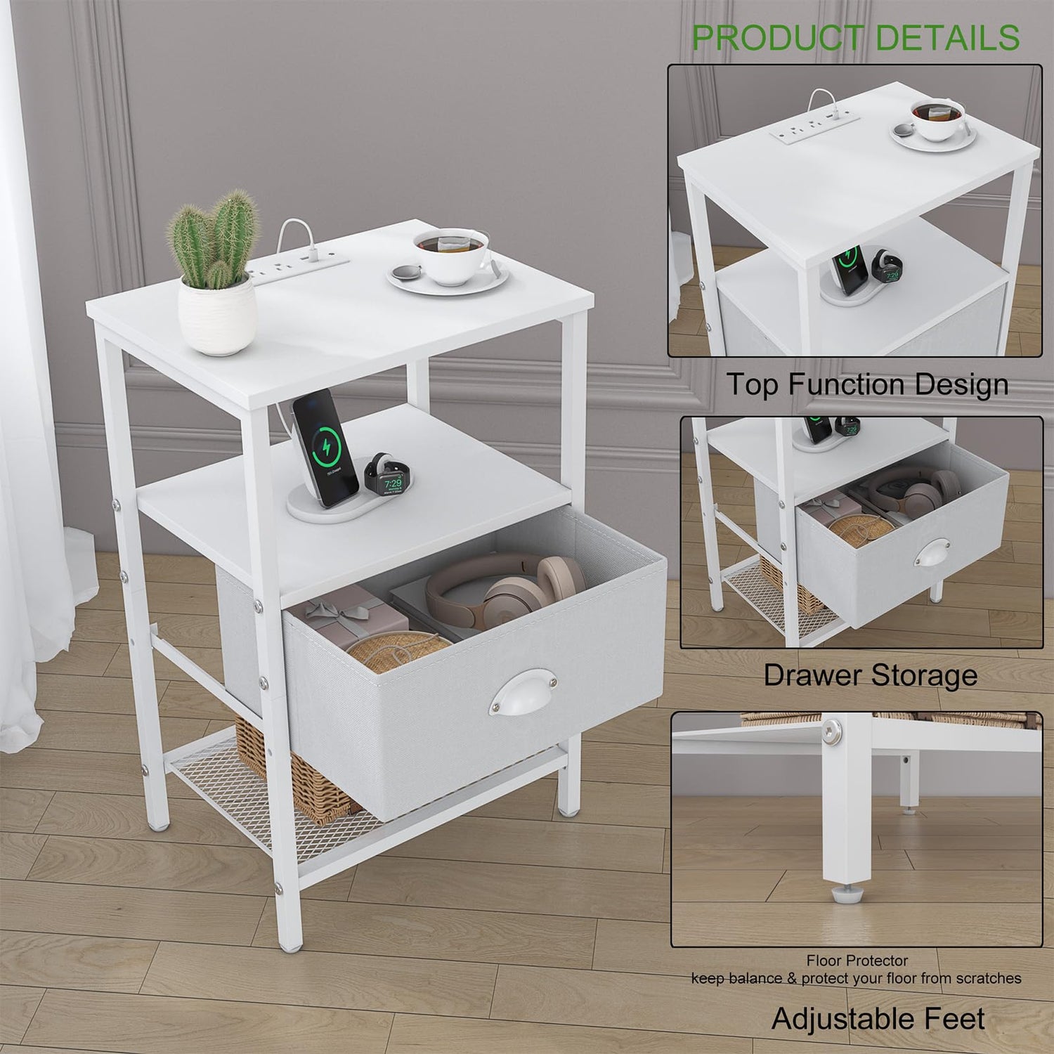 - Quality & Sturdy Night stand: Sthmec nightstands set of 2 designed with quality material,white side tables bedroom with particle board & robust metal frame & non-woven fabric drawer and 4 adjustable feet.Quality materials and versatile design ensures long-time and multiscenario for living room or bedroom daily use.Saving space and more organized,keep away from clutter