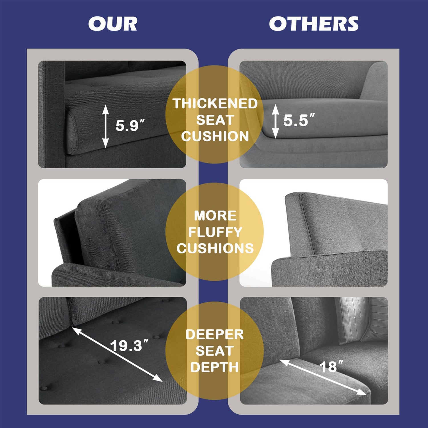 - 【High Comfy Up】We use fabric of cotton and linen, comfortable and breathable. The inside of the cushion is filled with highly elastic foam and the top is covered with soft doll cotton. U-shaped spring links are used between the solid wood frame at the seat bottom. The backrest has a slight tilt degree, which is fits the people body better. When you sit on this gray couch there is a feeling of being supported and wrapped.