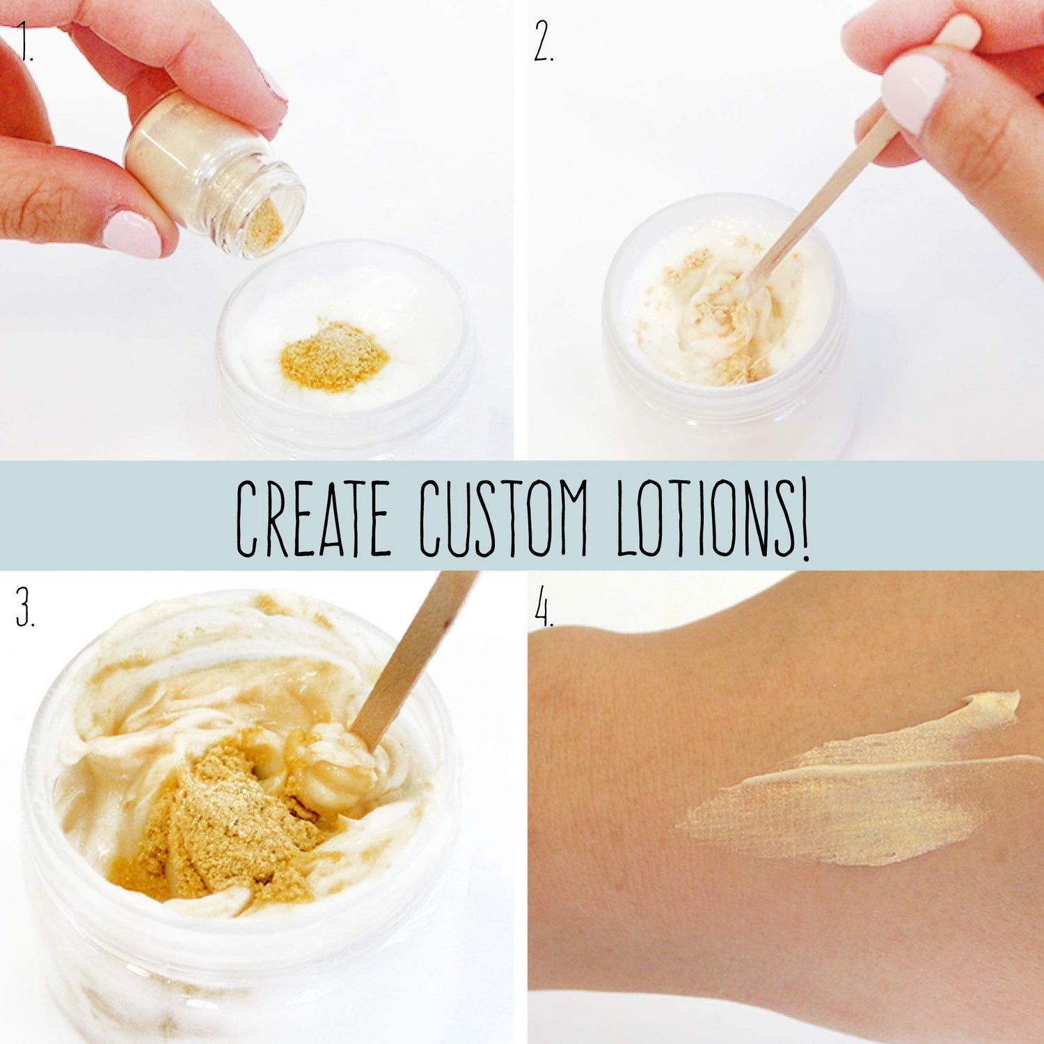 - SHIMMERING LOTION: Give yourself a golden glow by combining shimmering mica powder with a moisturizing lotion base and soul-warming fragrances like vanilla and sandalwood.