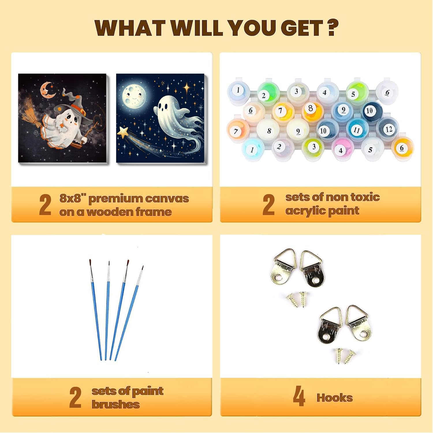 stnckic 2 Pcs Halloween Paint by Numbers Kits for Kids Framed,Ghosts Adults' Paint-by-Number Kits on Canvas Easy Acrylic Oil Painting by Number for Adults Halloween for Home Decor 8x8 inchs