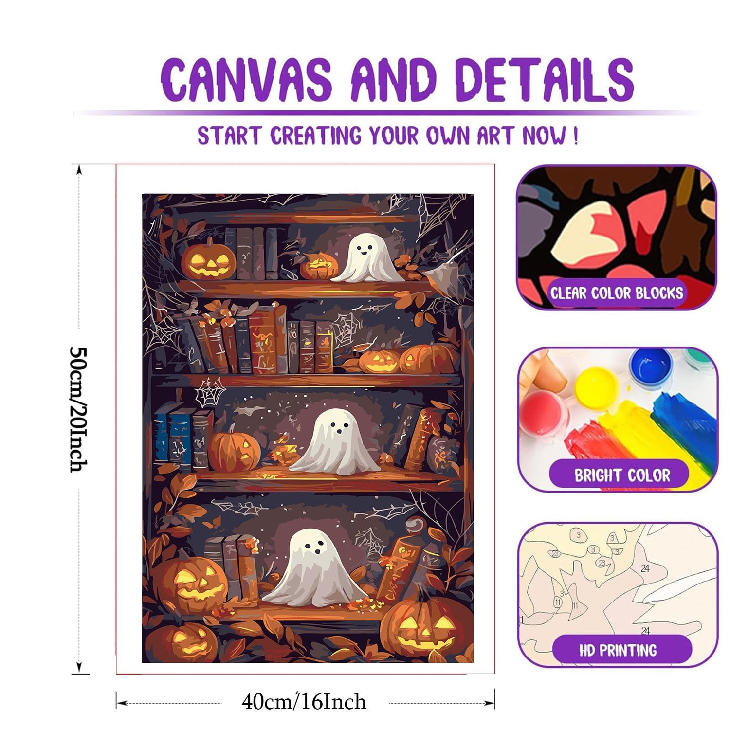 Details: Halloween Paint by Number kit for Adults, Ghosts Adults' Paint-by-Number Kits on Canvas Bookshelf Easy Acrylic Oil Painting by Number for Adults for Home Decor Gift 16x20 Inch