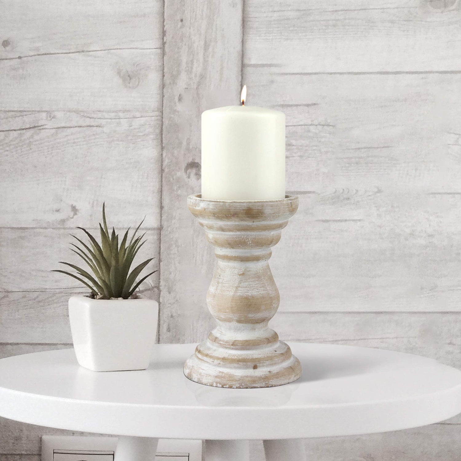 Details: Instantly add interest to any room in your home with Stonebriar's decorative worn white wooden pillar candle holder. This unique home decor accent piece features a decorative spun wood stand that has been lightly distressed for a vintage seaside feel.