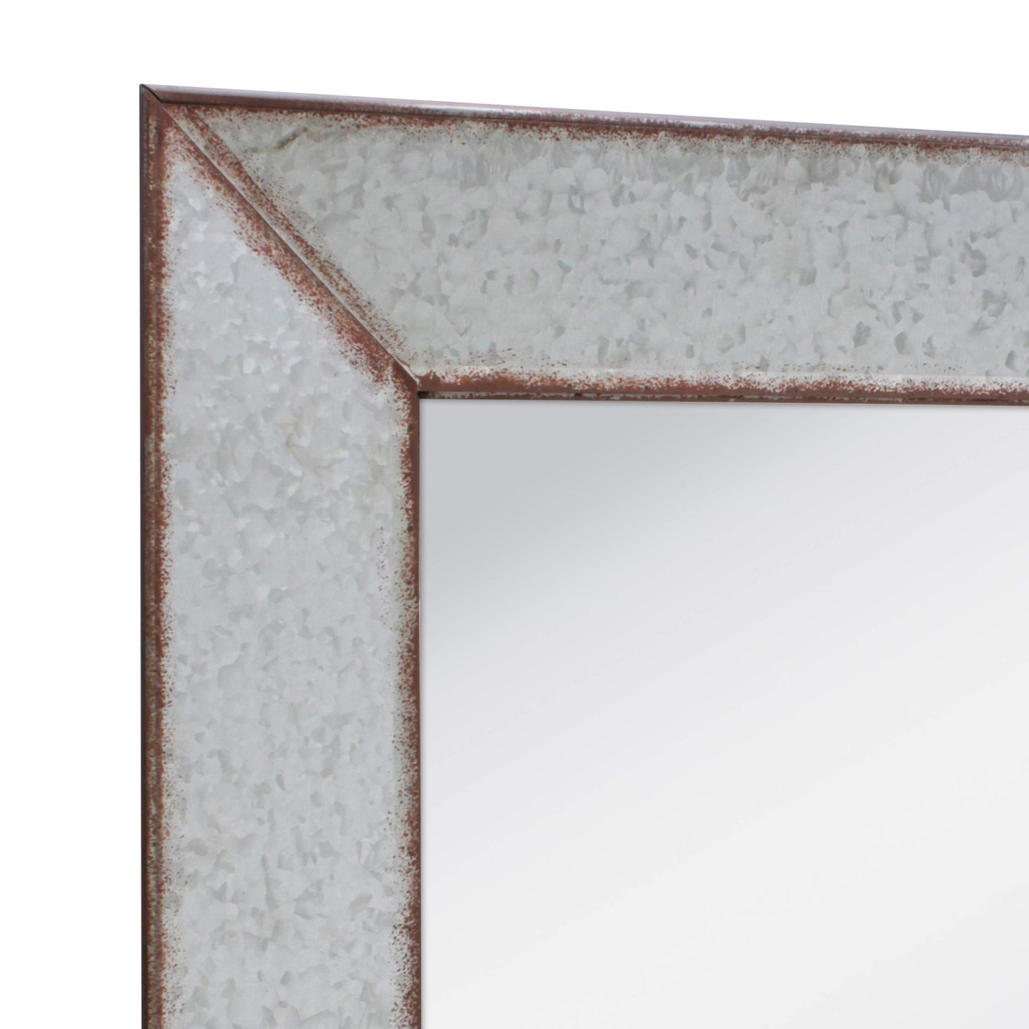 - This stylish mirror features a crystal clear reflection and a lightly distressed galvanized metal frame giving a vintage farmhouse feel