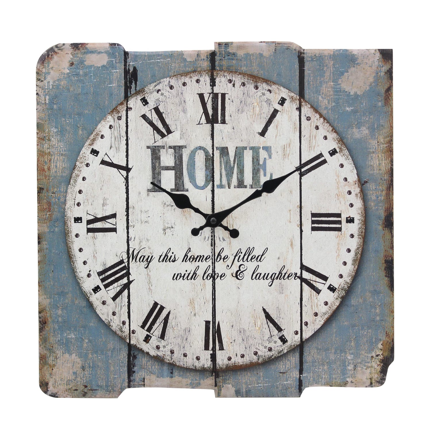 - Our rustic clock features a vintage worn white clock face print with distressed Roman numerals and worn blue background for an antique farmhouse feel