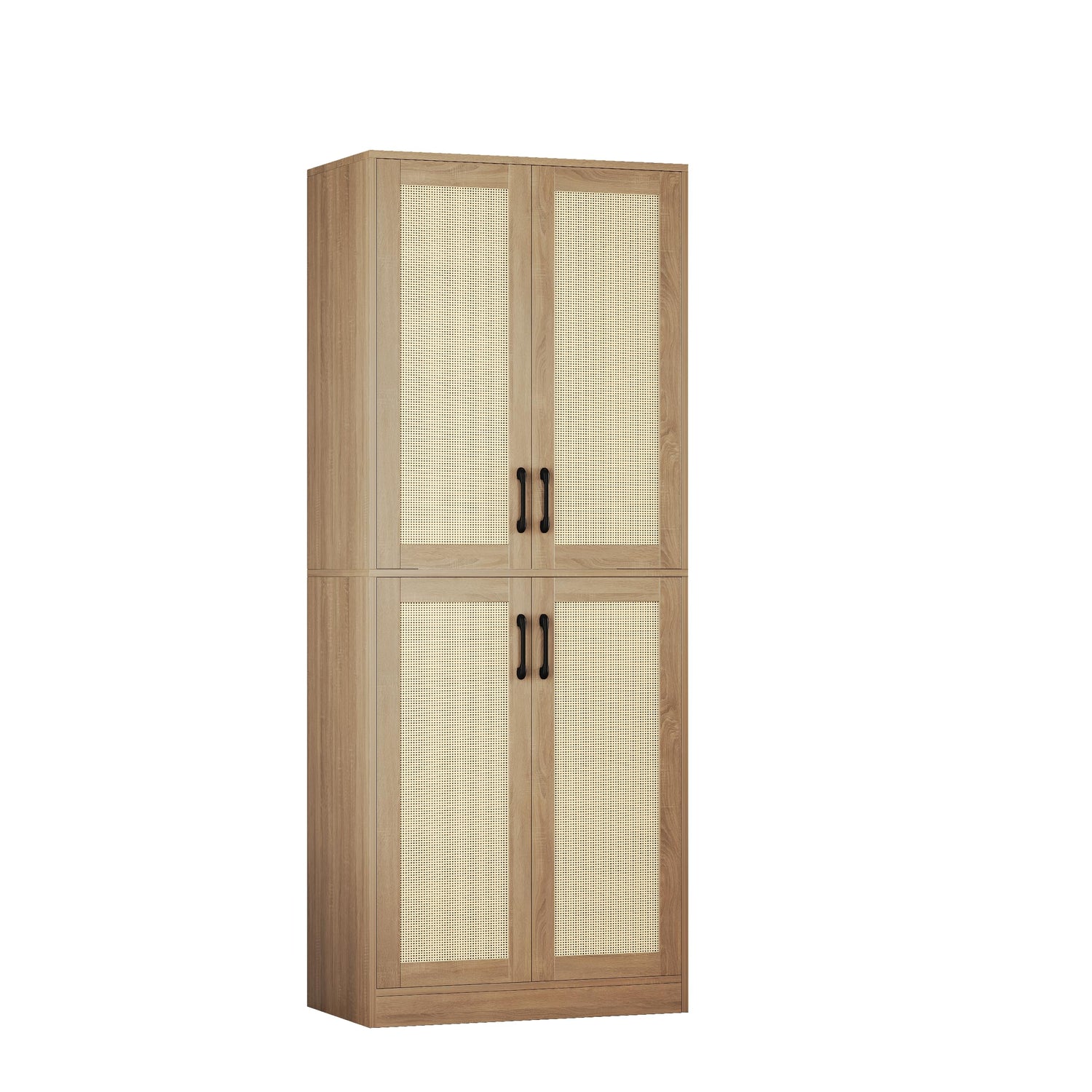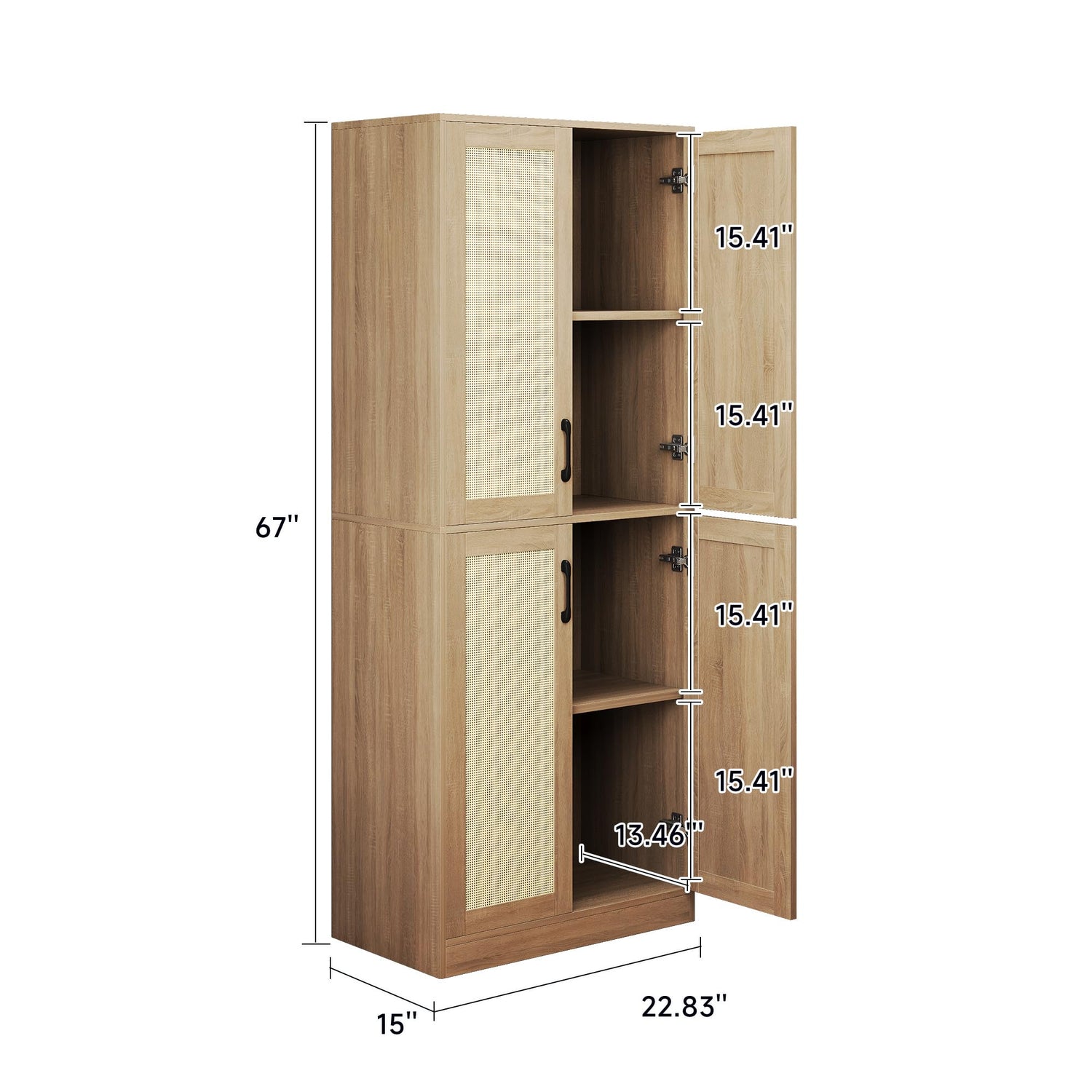 Storage Cabinet - Kitchen Pantry Cabinet, Rattan Cabinet, Tall Storage Cabinet with 4 Doors and Adjustable Shelf, Freestanding Cupboard for Kitchen, Bathroom, Laundry, Utility Room, Natural, 67" H