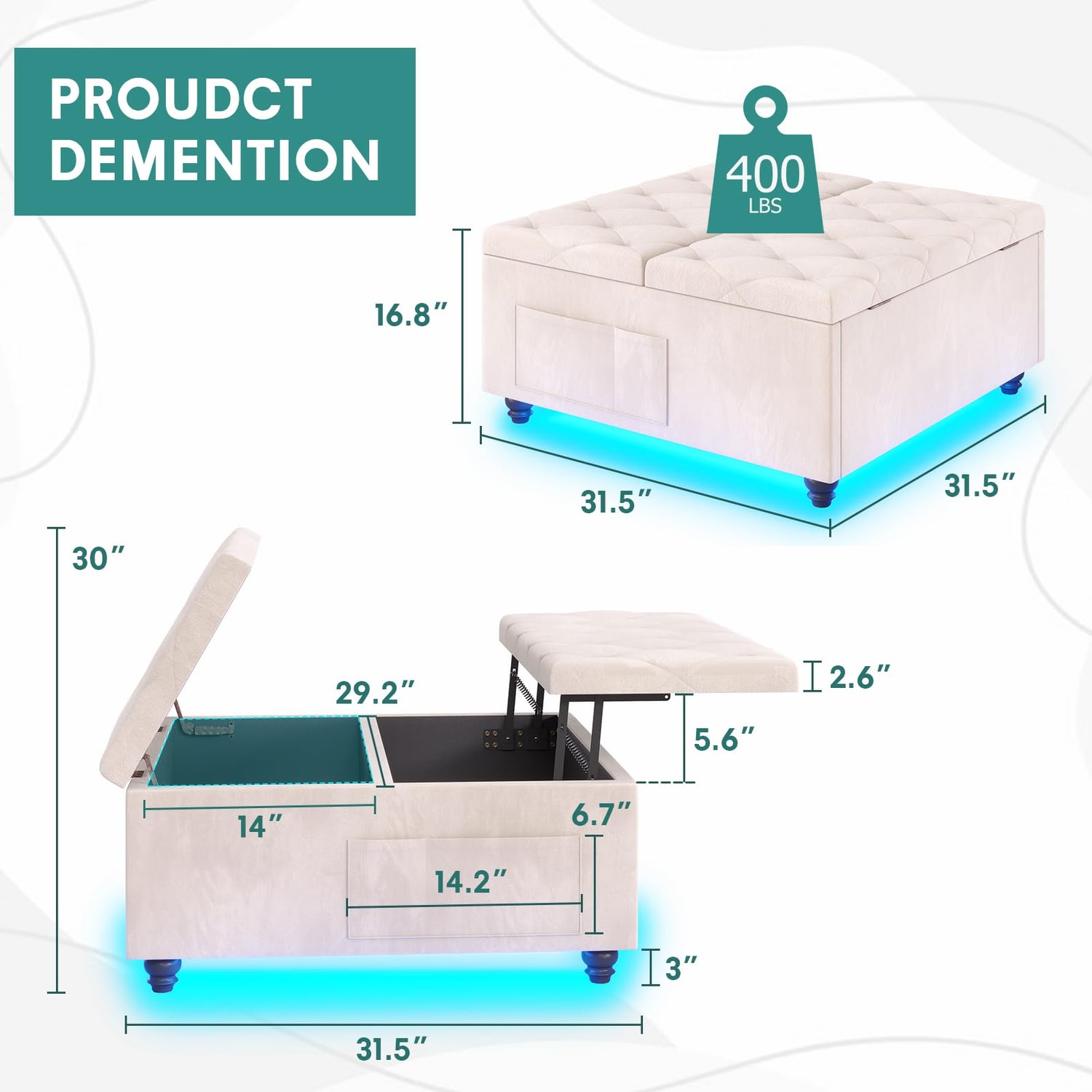 - STURDY & DURABLE CONSTRUCTION:Featuring a sturdy wood frame, and durable wood legs,our large ottoman with exquisite workmanship,it is built to last.Soft coffee table can support up to 300 pounds as a footrest and 100 pounds with the lift-top open,The metal pneumatic hinges provide stable and reliable performance.