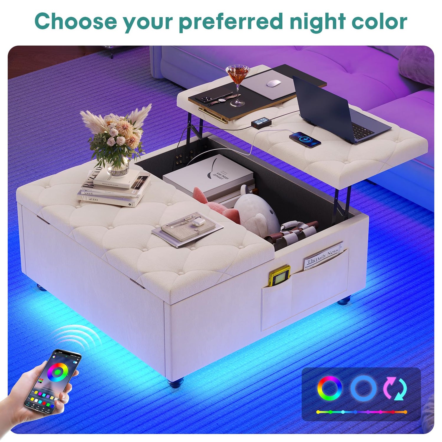 - OTTOMAN COFFEE TABLE WITH LED LIGHTS:Large square ottoman under with hidden LED light strips . The ottoman coffee table with storage with beautiful multi-color RGB LED light strip (over 60000 colors), controlled by APP control, and you can easily set the brightness, color, mode, and timing function according to your mood. Turn on the lights, and the living/bedroom will be filled with different atmospheres such as romantic, warm, and stylish