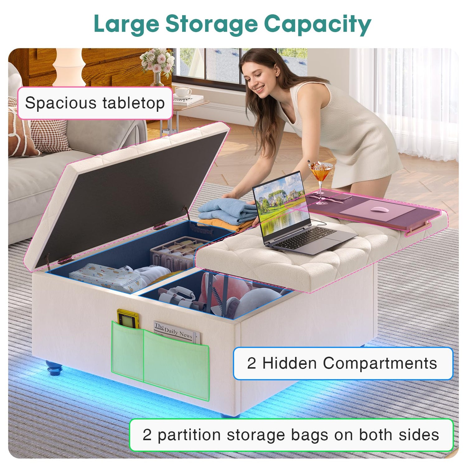Storage Ottoman Coffee Table,Square Ottoman with Storage & Charging Station and LED Lights,Velvet Buttons Large Ottoman Coffee Table with Lift Top & Solid Wood Legs for Living Room Bedroom (Beige)