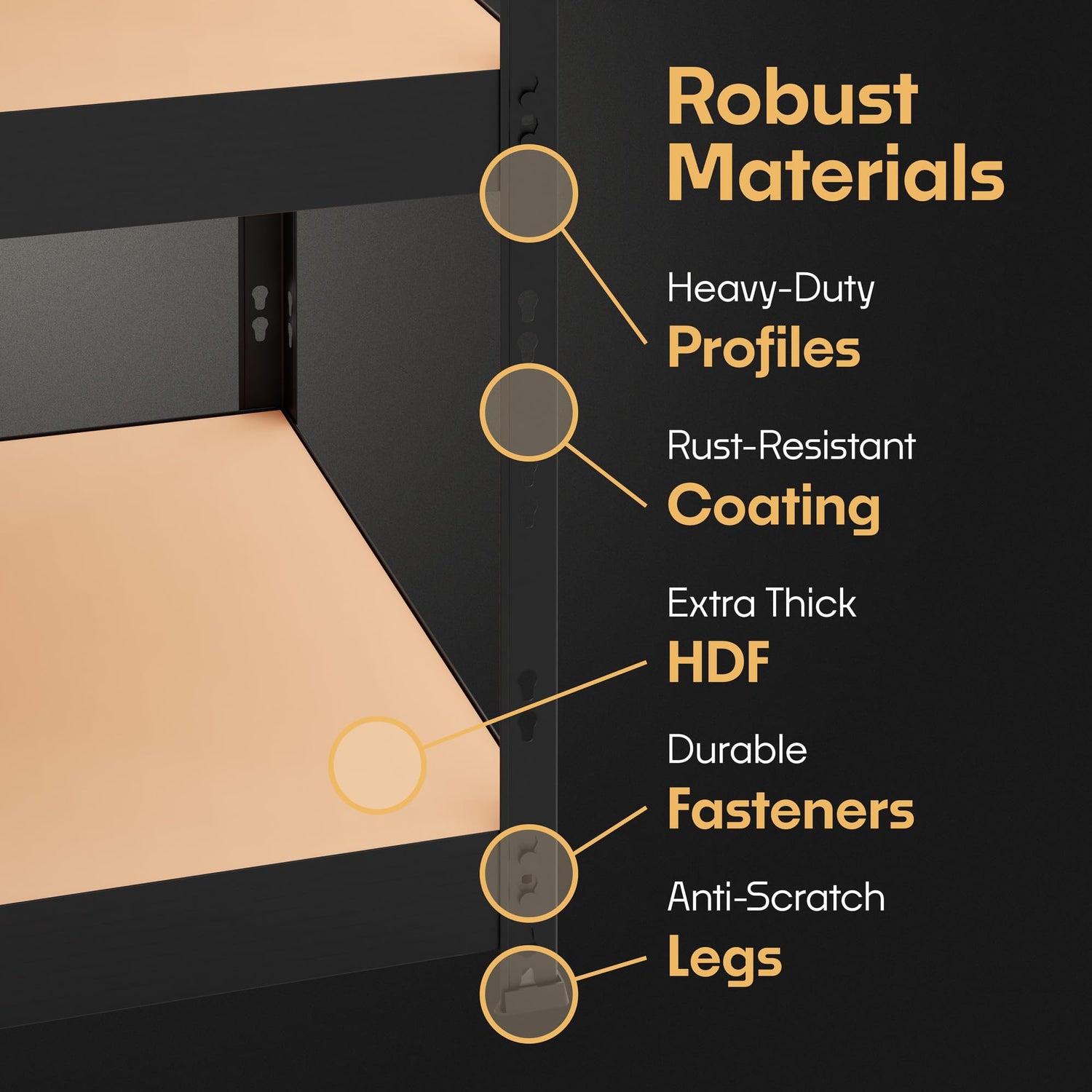 - PROPERLY STRONG AND DURABLE. Rely on this shelving to unfailingly hold your heavy possessions. All these metal shelves have extended profiles and rust-resistant coating. The heavy duty shelves themselves are extra thick HDF and come with robust bolts and rivets.