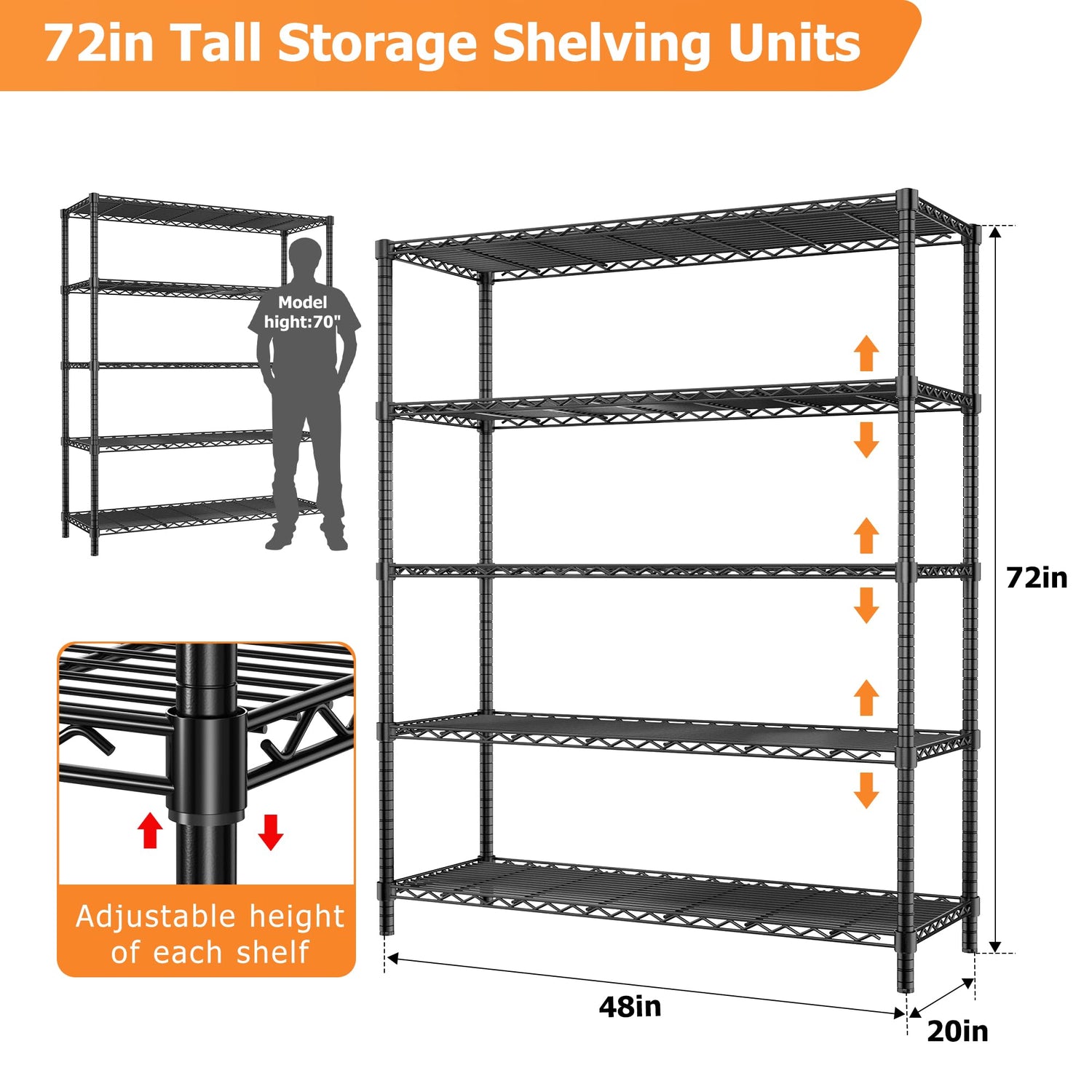 Storage Shelves Heavy Duty, 48" L x 20" W x 72" H Garage Wire Shelving Unit Loads 2000LBS, 5-tier Adjustable Metal Industrial Utility Shelf Rack for Kitchen, Laundry Room, Pantry, Warehouse, Basement