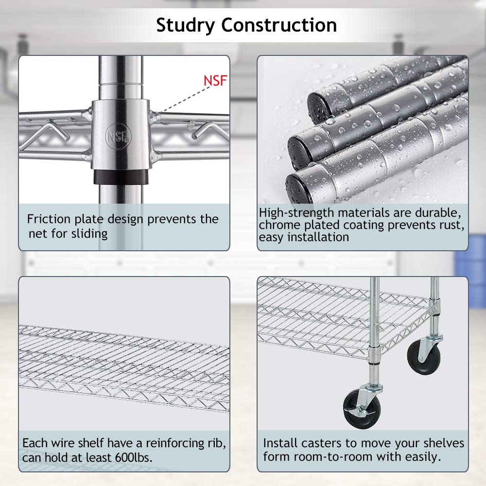 - ✔【100% SATISFACTION GUARANTEE】This wire shelving unit is NSF listed. The garage shelving coated with Eco-friendly chrome plated, perfect for kitchen, garage, bathroom, living room, office and more. And if you have any problem with the storage shelves, please get in touch with us. Wire shelving unit garage shelving metal storage shelves