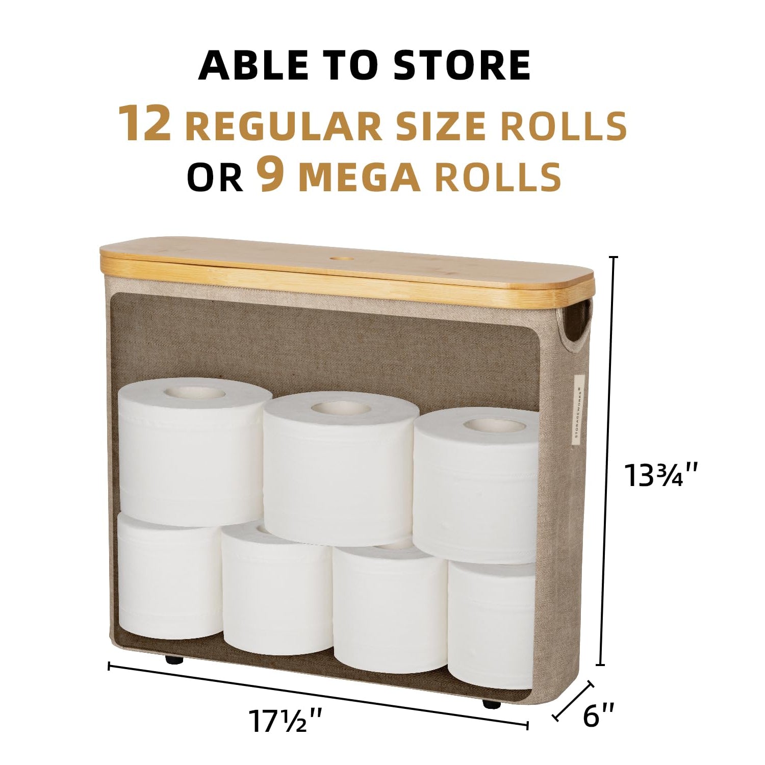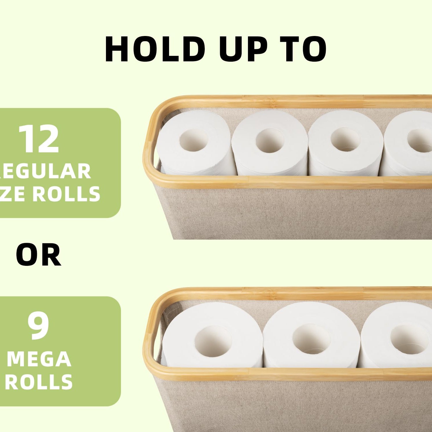 - Large Storage Capacity: Measuring 17.5”L x 6”W x 13.75”H, this toilet paper storage basket can hold up to 12 regular size rolls or 9 mega rolls. This paper organizer is made of bamboo and natural fiber in a sleek appearance, providing a practical bathroom storage solution for you.