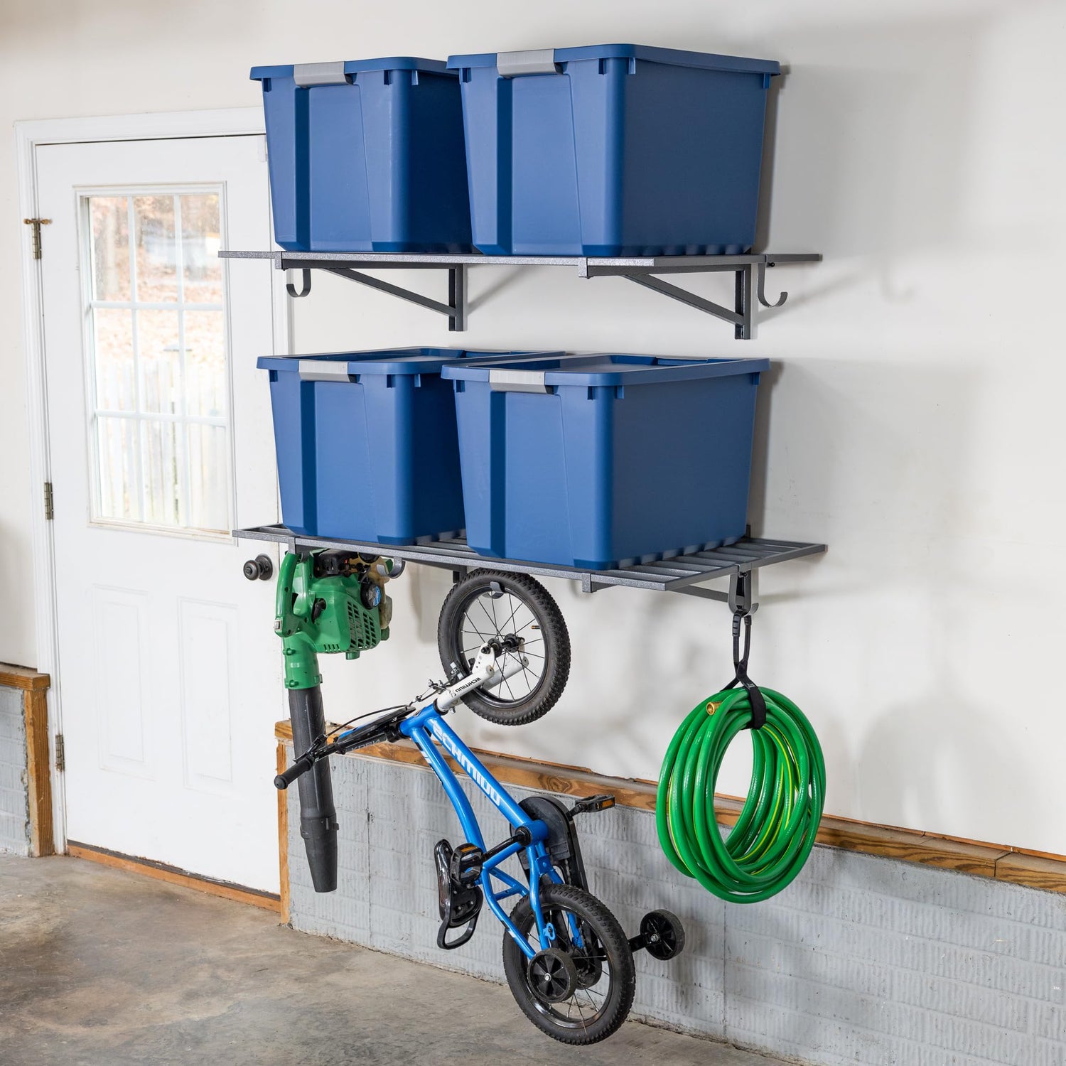 - Garage Wall Storage: Organize everything your indoor space has in store with this 2-pack of wall mounted shelves for bins, tools, sporting goods, tires, and more. Plus included hooks for hanging storage, you can conquer home and garage clutter.