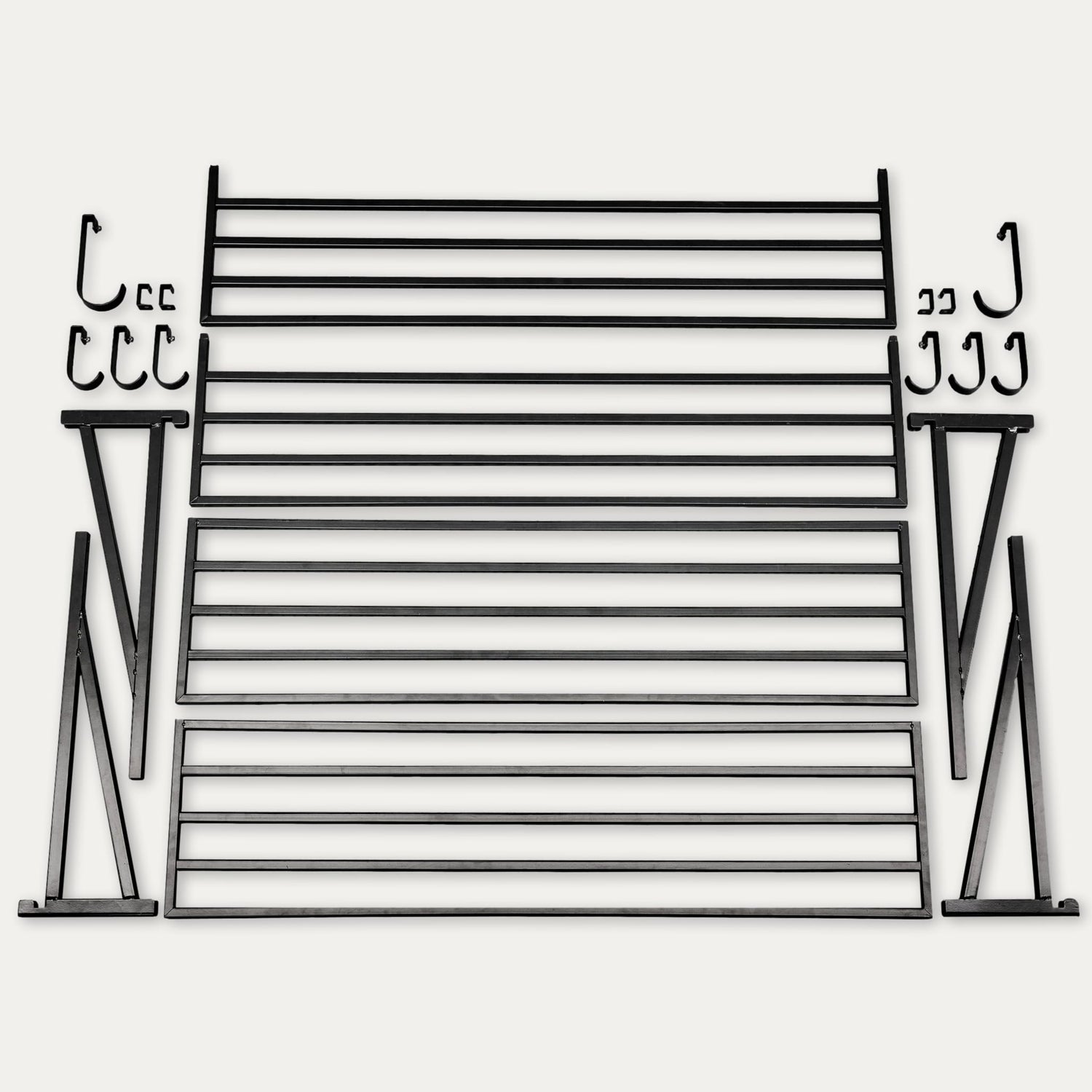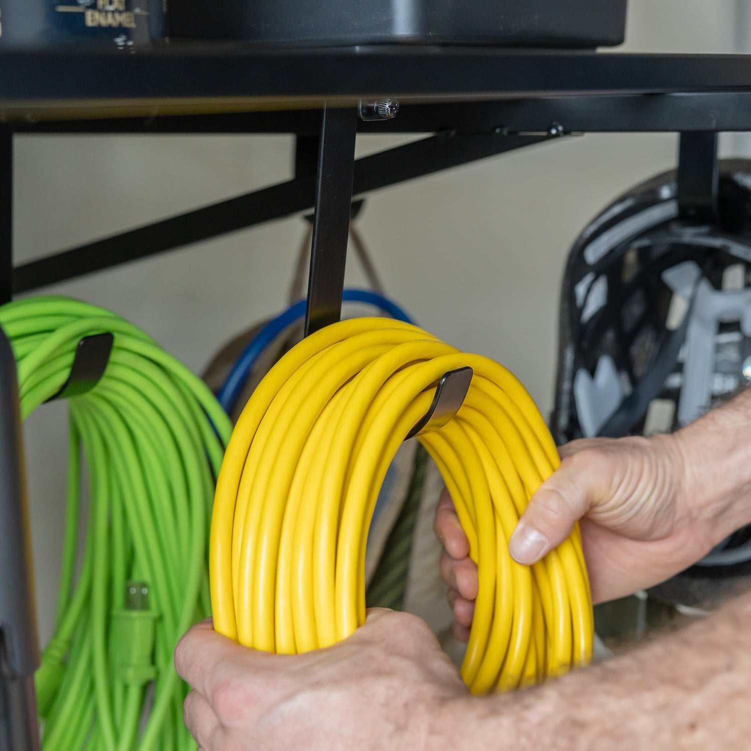 - HANGING HOOKS: Includes (2) Large Hooks and (6) Small Hooks for hanging storage below the shelves. Great for garden hoses, extension cords, bikes, and more.