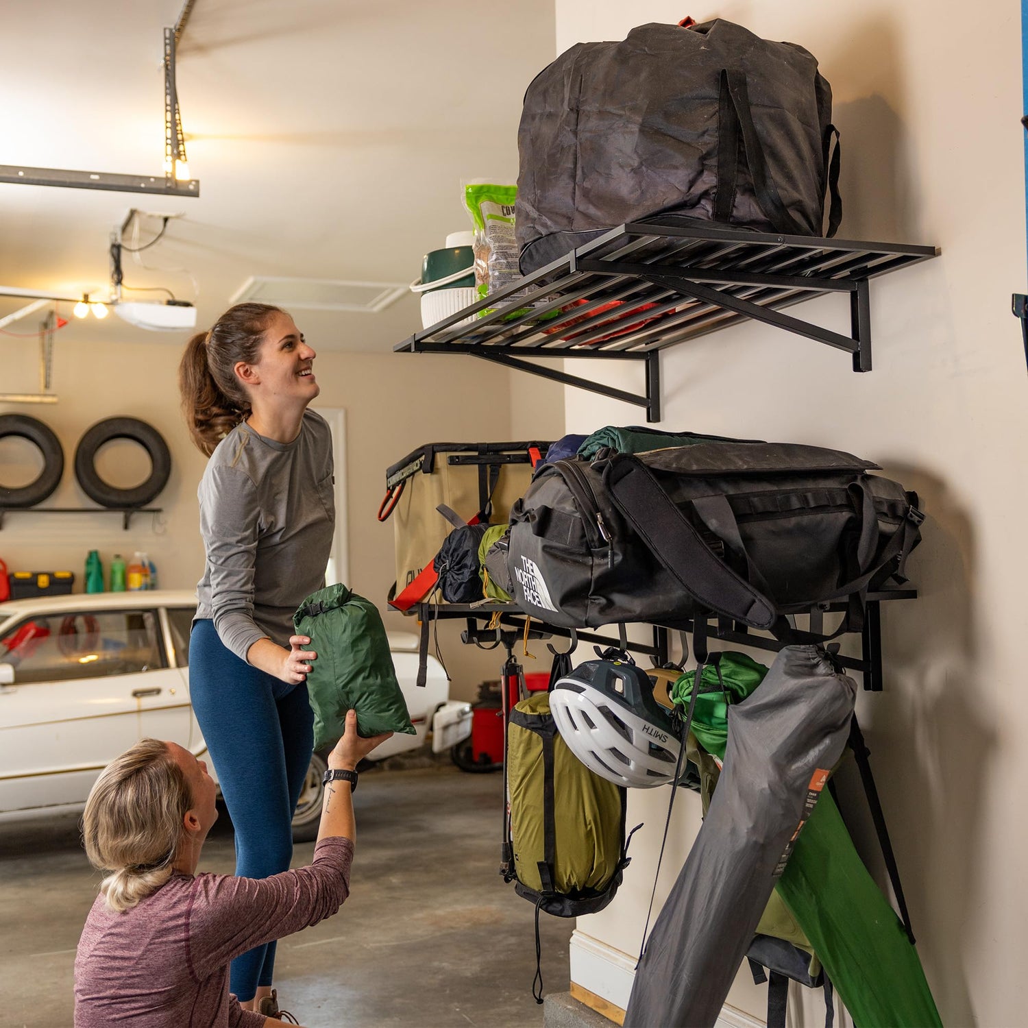 - GARAGE WALL STORAGE: Organize your garage with this 2 Pack of large wall mounted shelves! Perfect for storage bins, boxes, tires, sporting goods, and more!