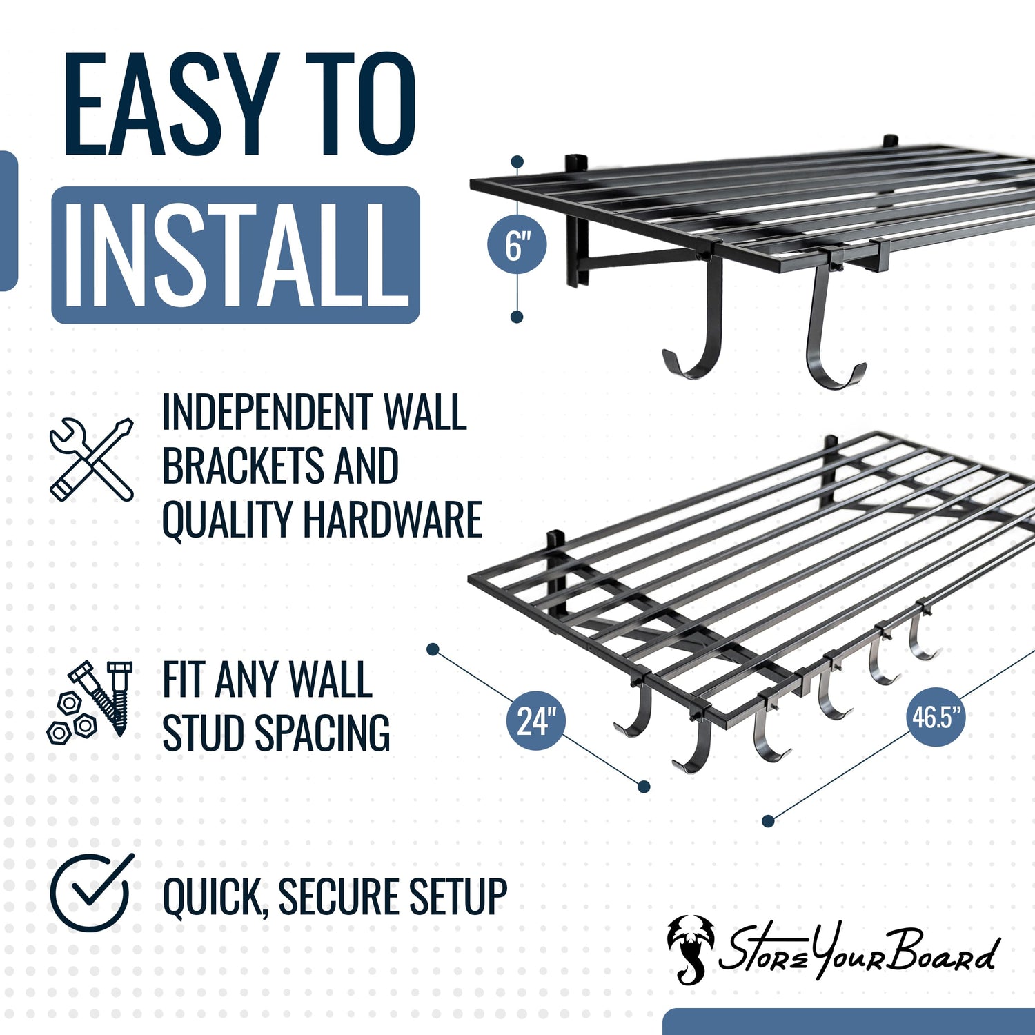 - EASY TO INSTALL: Independent wall brackets and quality hardware fit any wall stud spacing for a quick secure setup.