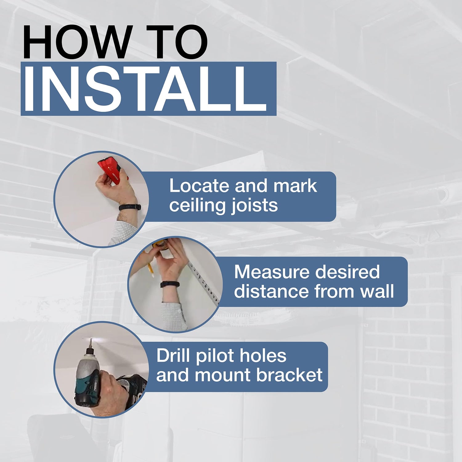 - EASY TO INSTALL & USE - The ladder shelf installs directly into ceiling joists, transforming wasted overhead space into retractable garage ceiling storage. Use it as a ceiling storage rack to organize ladders safely indoors, keeping your garage shelving units clutter-free and your tools accessible.