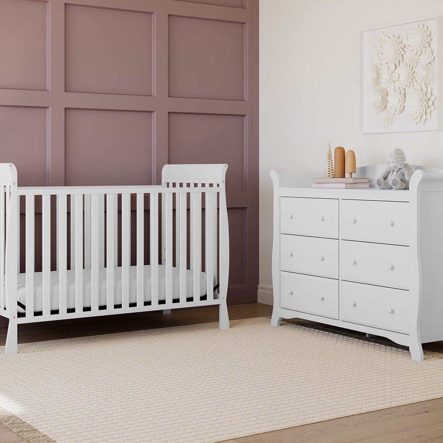 - NURSERY AND KIDS BEDROOM DRESSER: Nursery and kids dresser for bedroom with 6 drawers, traditional sleigh design, and classic style; Crafted of wood framing and wood composites, and includes Euro drawer glides; Assembly required; Anti-tip kit included