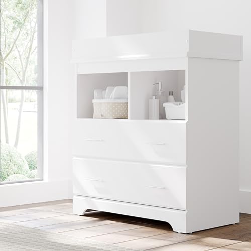 Storkcraft Brookside 2 Drawer Changing Table Dresser (White) – GREENGUARD Gold Certified, Easy-to-Match Chest of Drawers and Cubbies for Nursery and Kids Bedroom, Includes Changing Table Topper