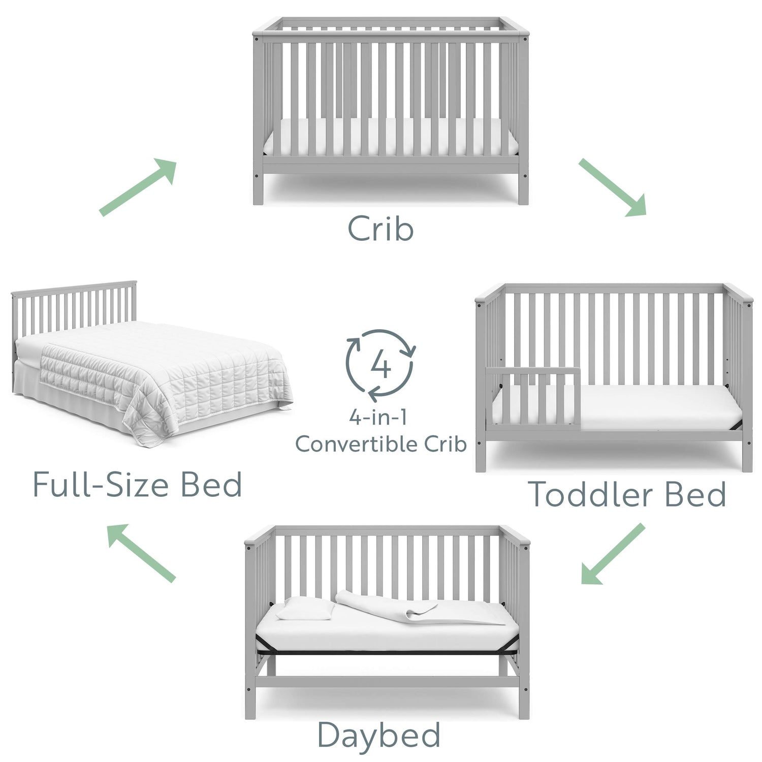 - 4-IN-1 CONVERTIBLE CRIB: Converts from crib (mattress sold separately) to toddler bed (compatible with 1 or 2 toddler guardrails, each sold separately), daybed, and full-size bed (compatible full-size bed conversion kit sold separately; Assembly required