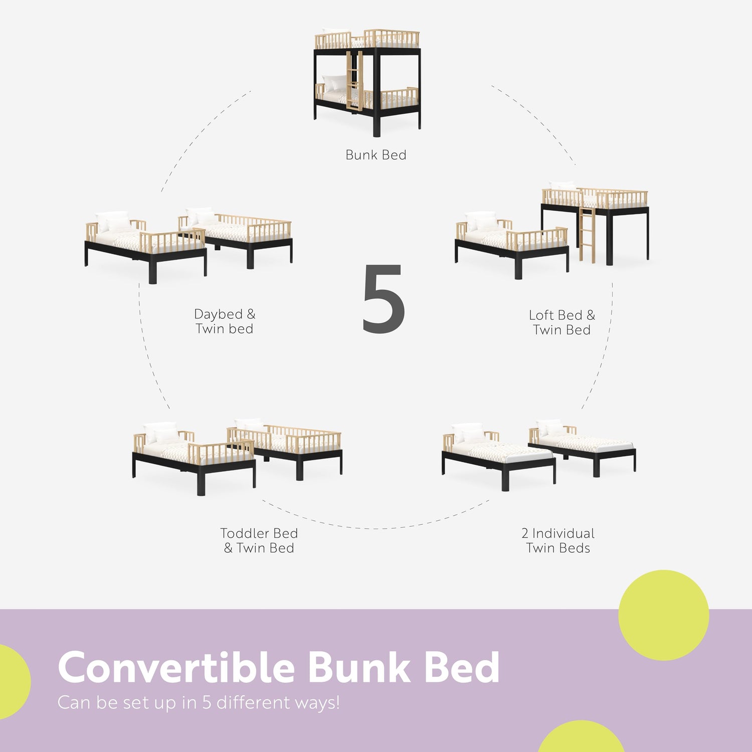 - BUNK BED WITH 5 CONVERSIONS: (1) Twin-over-twin bunk bed; (2) Two twin beds; (3) Loft bed and twin bed; (4) Toddler bed and twin bed; (5) Daybed and twin bed; Mattresses not included