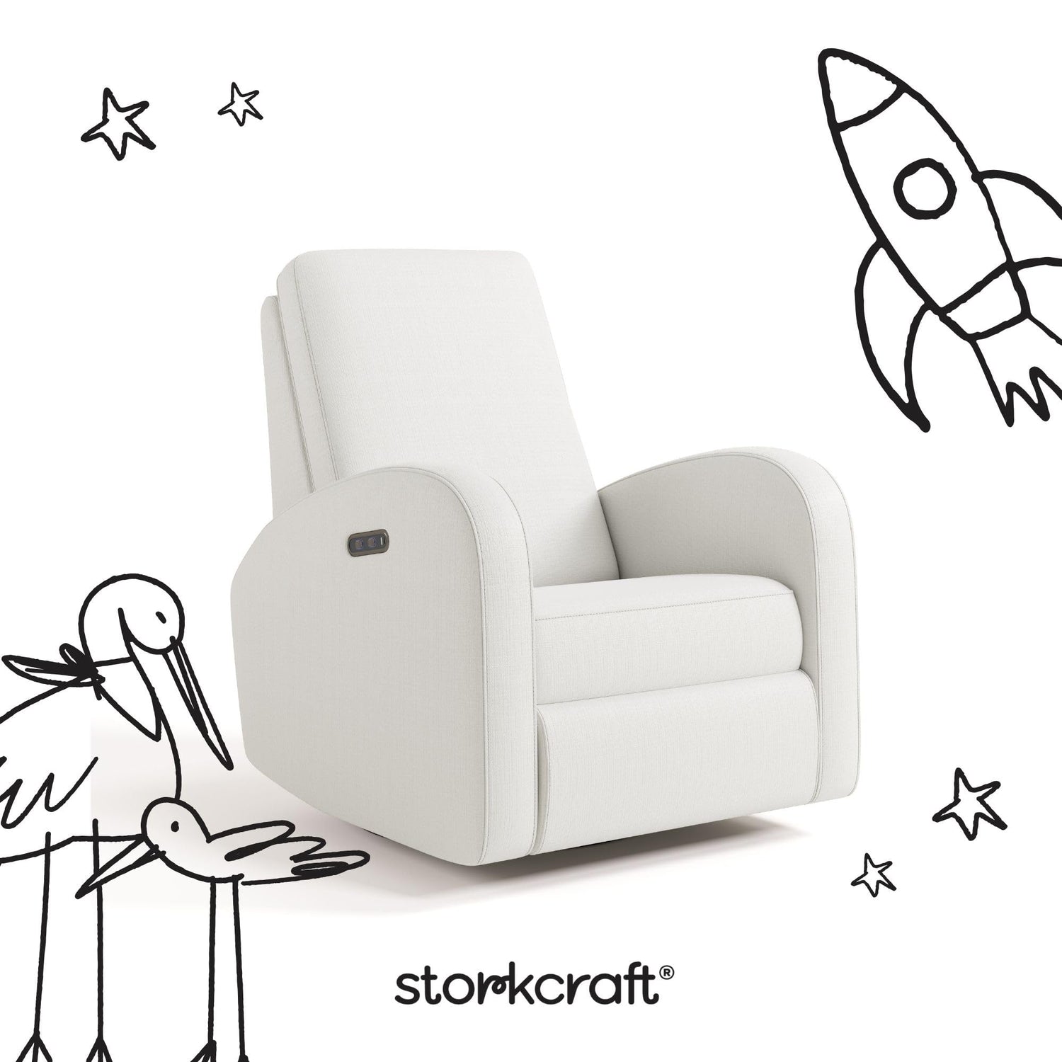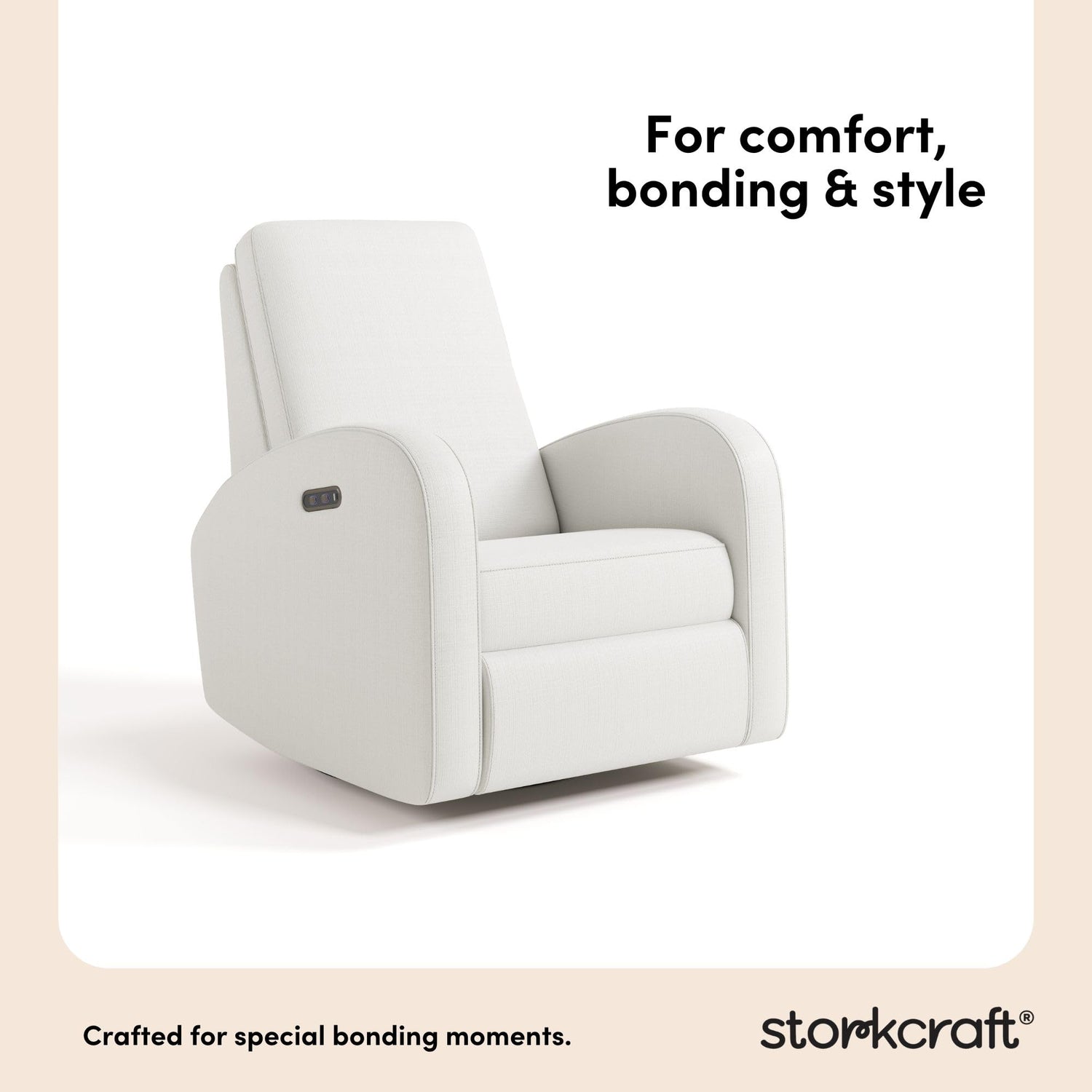 - ELECTRONIC POWER RECLINER & SWIVEL GLIDER: Storkcraft's most premium nursery recliner, effortlessly recline (and sit back up) with the simple touch of a button; Smooth gliding motion; 360-degree swivel motion with durable metal base for long-lasting use