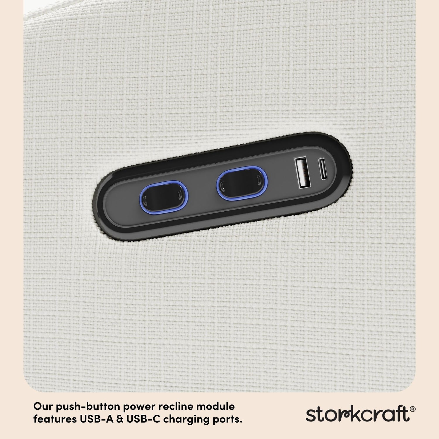 Details: Our most premium nursery glider, ever: introducing the Storkcraft Santa Monica Power Recliner Swivel Glider. Crafted for you to rest and relax in style and comfort, the Santa Monica swivels, glides, and features an electronic “power recline” function so you can lean back (and sit back up) effortlessly, with the Santa Monica doing the work for you. Keep your tablet, phone, and new-age baby essentials charged with the Santa Monica’s USB charging port – equipped with USB-A and USB-C charging ports. Available in our premium basketweave or boucle fabrics, the Santa Monica features a modern yet timeless rounded silhouette, and was designed for a comfortable nursing experience. Exclusively from Storkcraft, makers of fine nursery furniture since 1945. Made with your family in mind, the Storkcraft Santa Monica Power Recliner is backed by a 1-year limited warranty and Storkcraft's supportive Customer Care team. Exclusively from Storkcraft, proud recipient of the Parent Tested Parent Approved (PTPA) Seal of Approval.