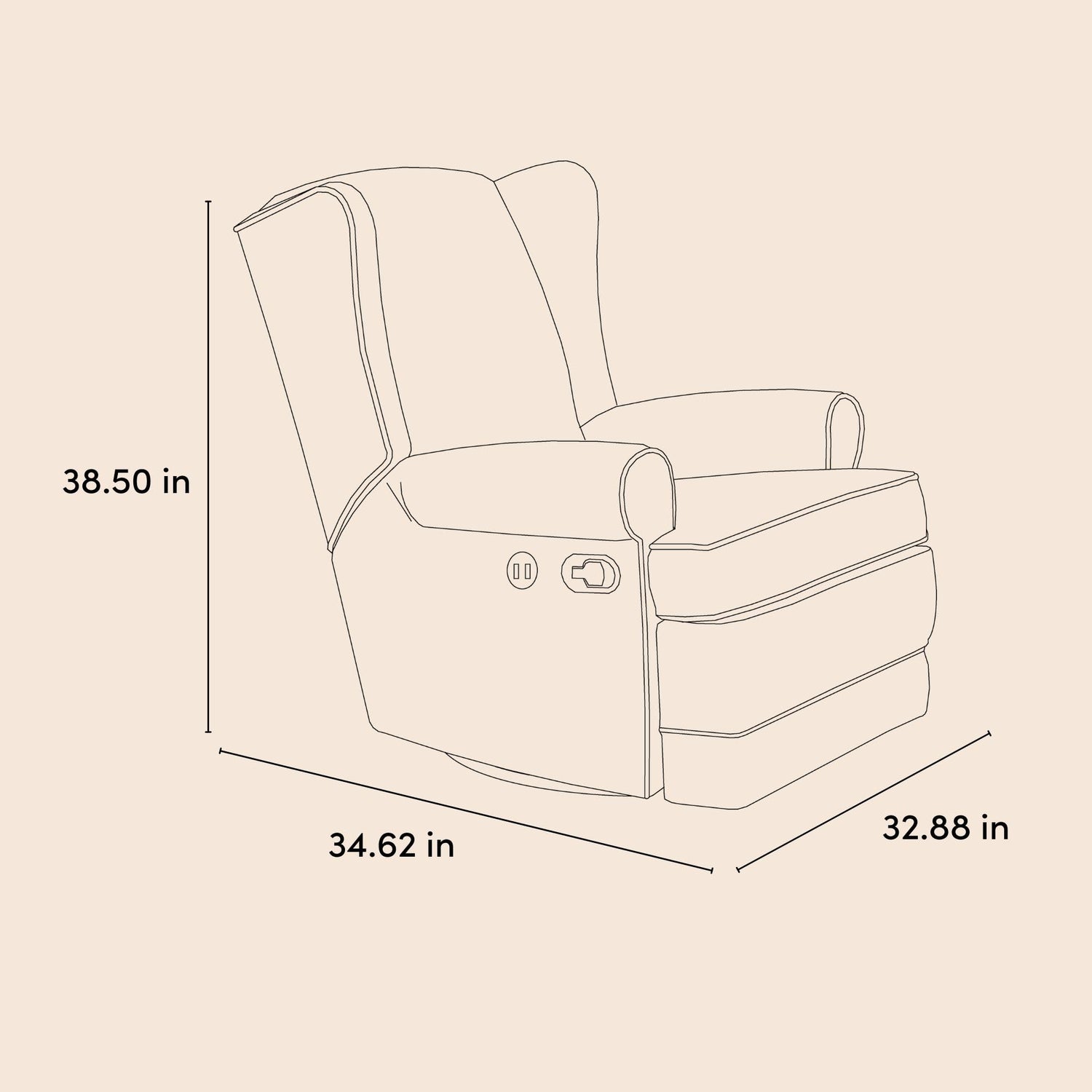 - FULLY UPHOLSTERED GLIDER: Upholstered in durable yet comfortable water-repellant, eco-friendly fabric, this plush, supportive, USB-friendly reclining glider with 360-degree metal swivel base was crafted for years of use and enjoyment
