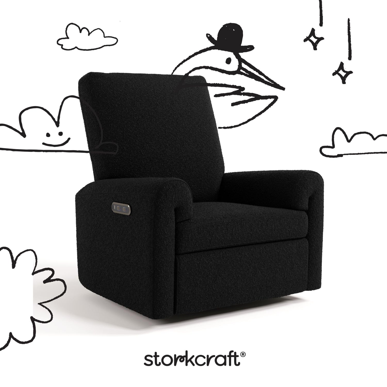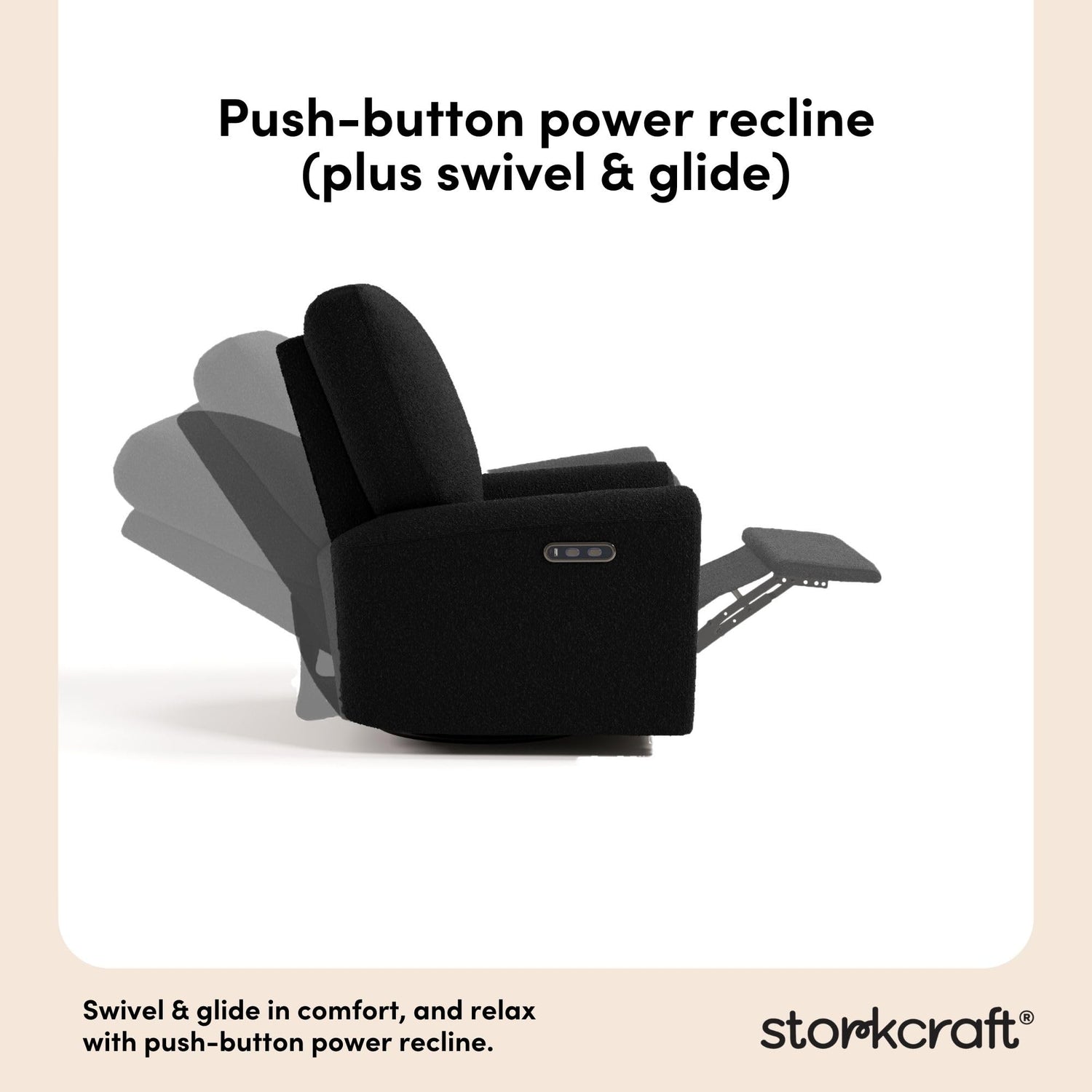 - PUSH-BUTTON RELAXATION — PREMIUM ELECTRONIC POWER RECLINER SWIVEL GLIDER: Storkcraft’s most premium nursery recliner, highlighted by its “reverse roll arm” upholstery and modern style, designed to effortlessly recline (and sit up) with the push of a button