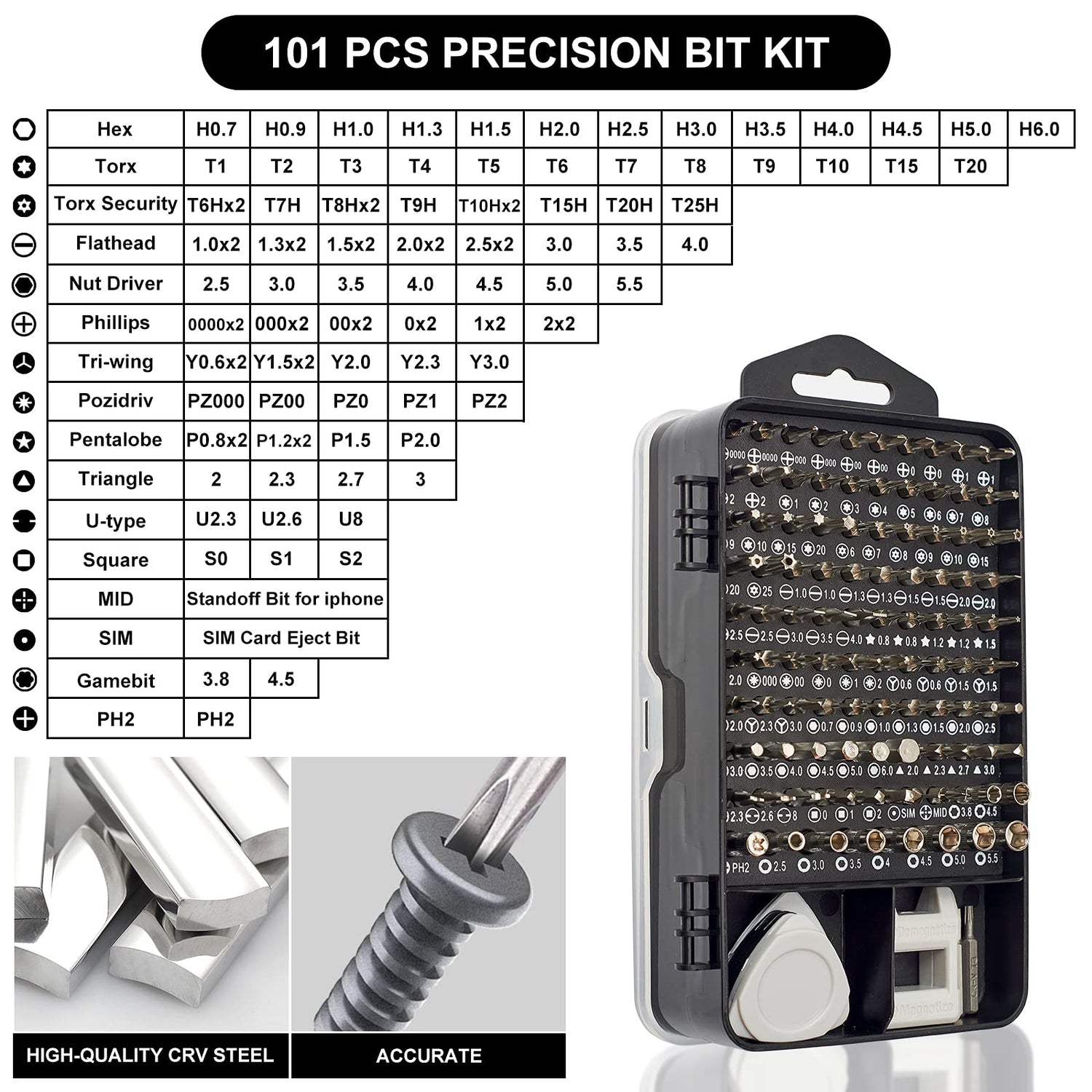 - 【Variety & Versatility】STREBITO 124 electronic screwdriver set includes 101 precision bits, complete with every driver head you'll need to repair any electronics, such as Apple & Android mobile phone, PC, laptop, iPhone, Mac, Nintendo, PlayStation 5/4/3, Xbox series game console & controller, tablet, iPad, RC toys, watch, eyeglass, etc. This is the do-everything toolkit every DIYer, fixer, IT geek, professional tech and hobbyist needs, also a decent gift for your family, friends, colleagues, etc