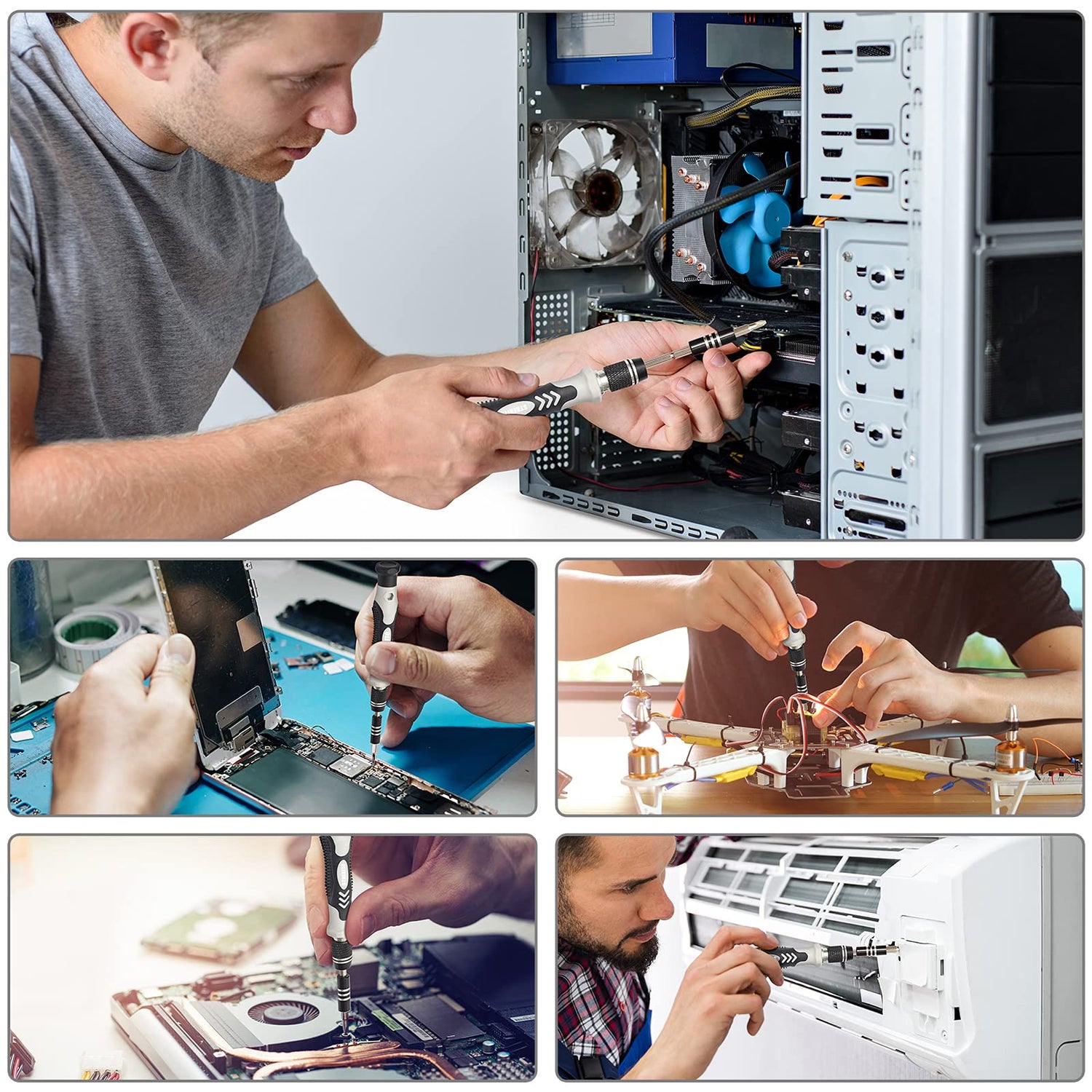 - 【Innovation Design】 We have professionally designed this laptop screwdriver kit for maximum humanization, make your repair job easier and more efficient. The screwdriver features a non-slip grip and rubberized, ergonomic handle with swivel top, provides a comfortable grip and smoothly spinning. Magnetic bit holder transmits magnetism through the bit, helping you handle tiny screws. And flexible extension shaft is 360° bendable, perfect for removing fastener in tight spots