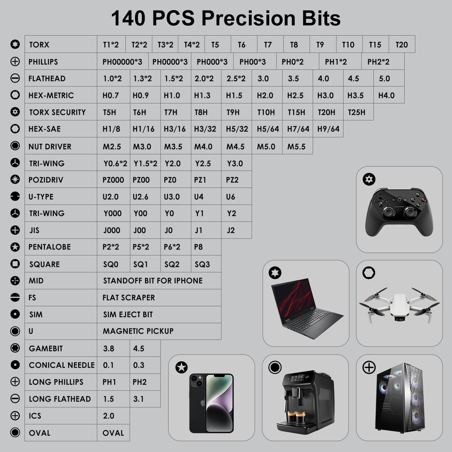 - 【Wider Application】The STREBITO Precision Screwdriver Set is professionally designed for electronic repair. With 140 precision bits - Phillips, Pentalobe, Torx Security, Star, SAE/Metric Hex, JIS, Flat Head, Triwing, Triangle, Square and more, this screwdriver kit is versatile to meet your different daily use, such as PC, Computer, Laptop, Cell Phone, Macbook, RC Car, Drone, Nintendo Switch, PS4 Controller Console, Watch, Eyeglass, Coffee Machine, Ring Doorbell, and other IT tech devices
