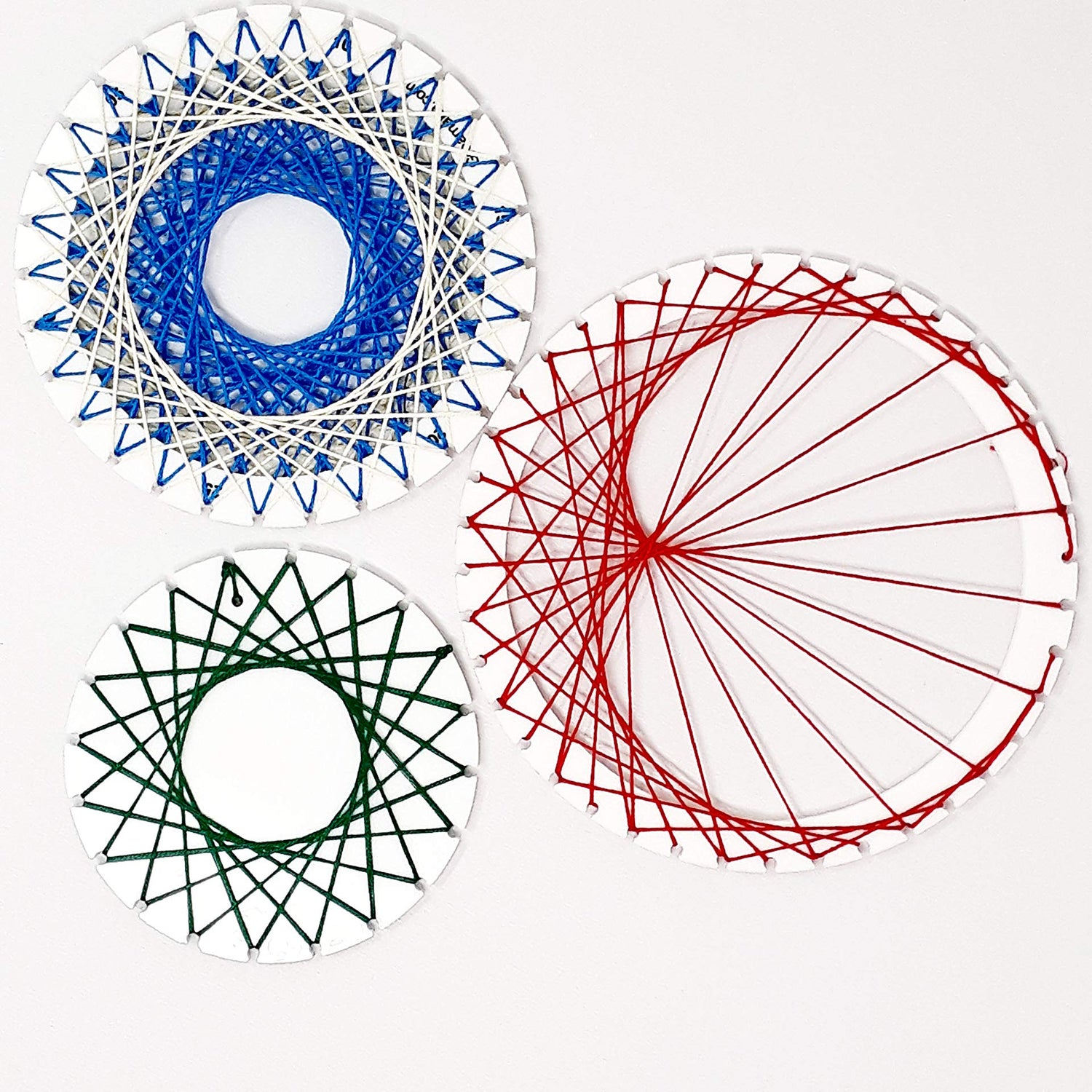 - Looking for a new gift idea? Then this is the one ! Set of 3 frames - 20, 30 and 40 points with outermost frame having diameter of 150 mm and with 3 colorful threads. Made of laser cut strong acrylic material, not affected by moisture or heat, the set has no pin, nails or holes to drill , ready-to-use, so simply string through !