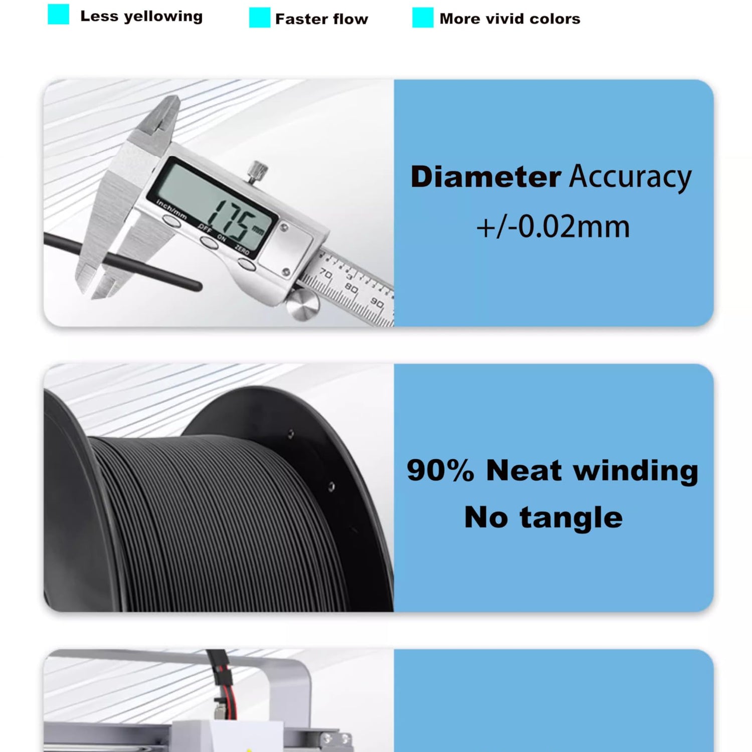 - Better flow ,premium 1.75mm PLA filament. It has consistent diameter & roundness, less stringing and warping, strong layer adhesion. No impurities, no clogged, vacuum package with zipper Bag, net weight 1KG/Spool