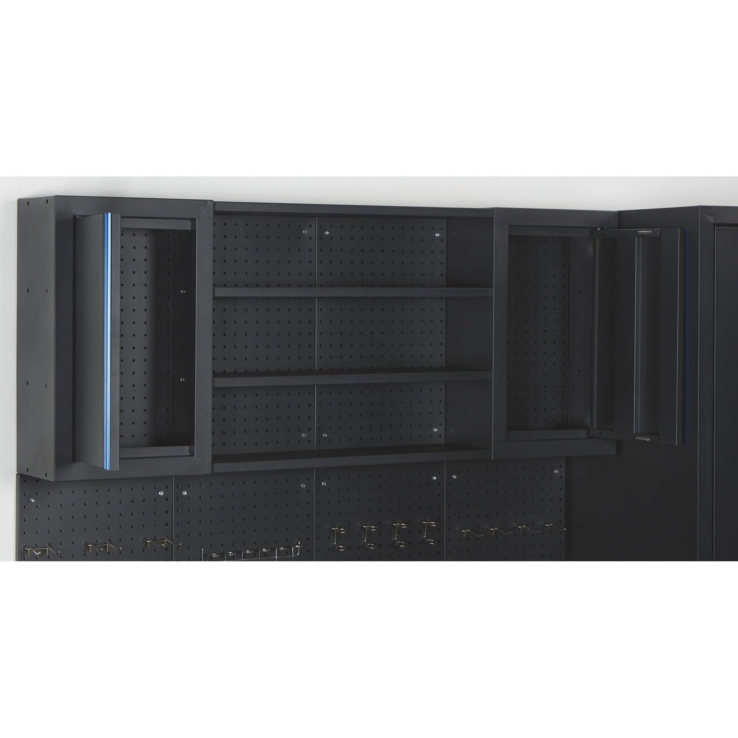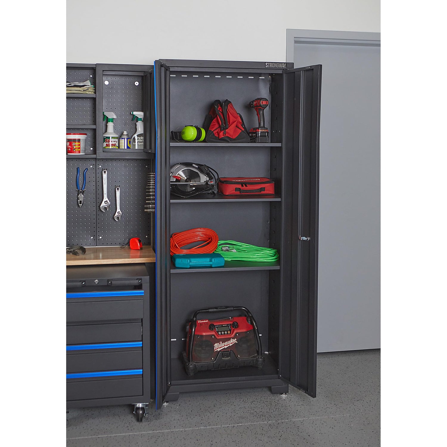 Details: The Strongway 6-Pc. Garage Storage System offers an upgrade to the look and organization of your garage. Built with heavy-duty steel frames for extra-strength, the cabinets in this system are ideal for storing sports equipment, seasonal decor and tools. The powder-coat paint finish gives protection against scratches and rusting, making the cabinets perfect for rugged use. Lockable doors keep items secure.