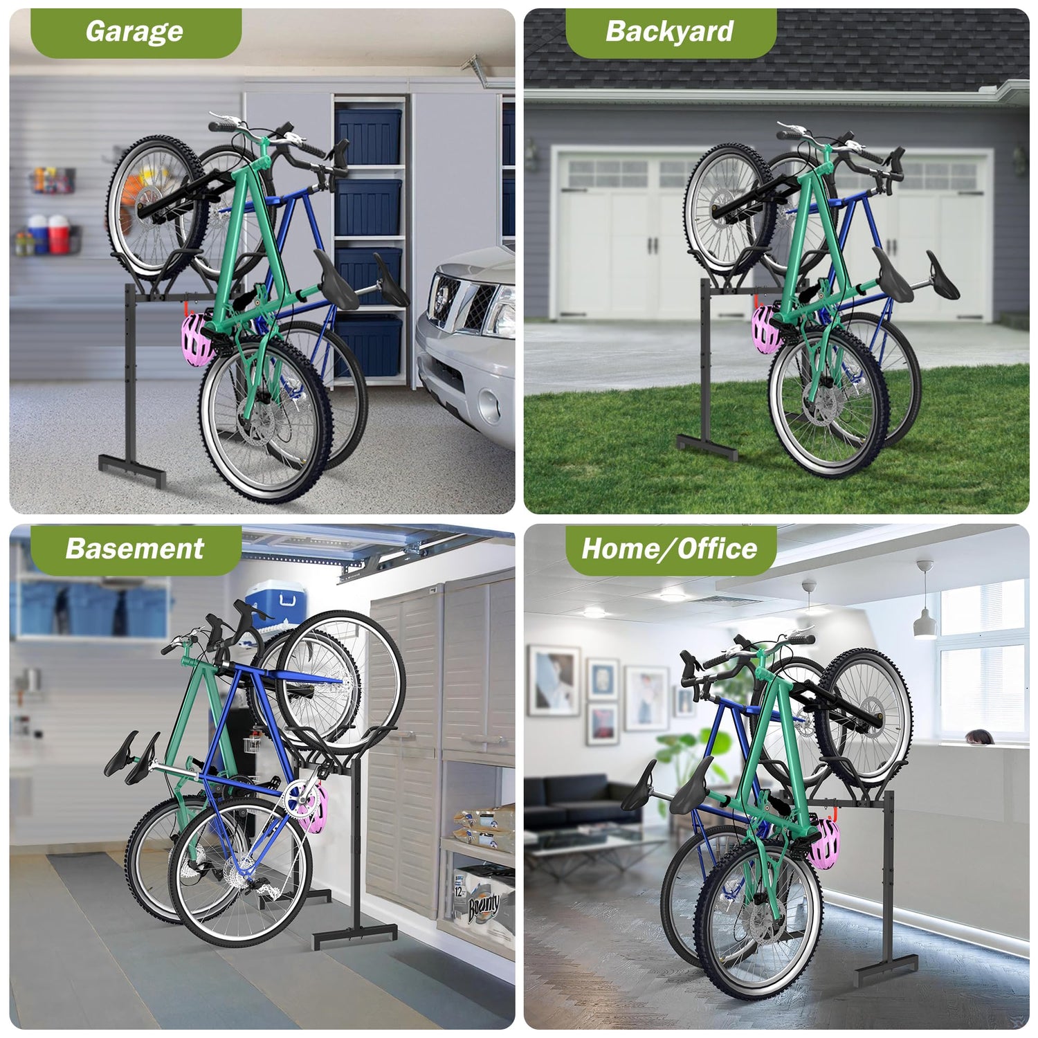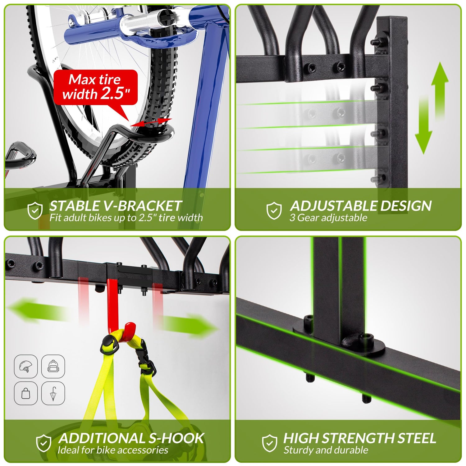 - Multifunctional Freestanding Bike Rack: Our bike floor rack serves as the paramount bike storage solution for various settings – be it your garage, basement, backyard, or even outdoor. With its capacity to comfortably fit 2 bikes, the rack can accommodate adult bikes with tire width up to 2.5". It‘s great for most kinds of bikes, including road bikes, mountain bikes, hybrid bikes and kids bikes. Its versatility and thoughtful engineering make it a reliable choice for bike storage solutions.
